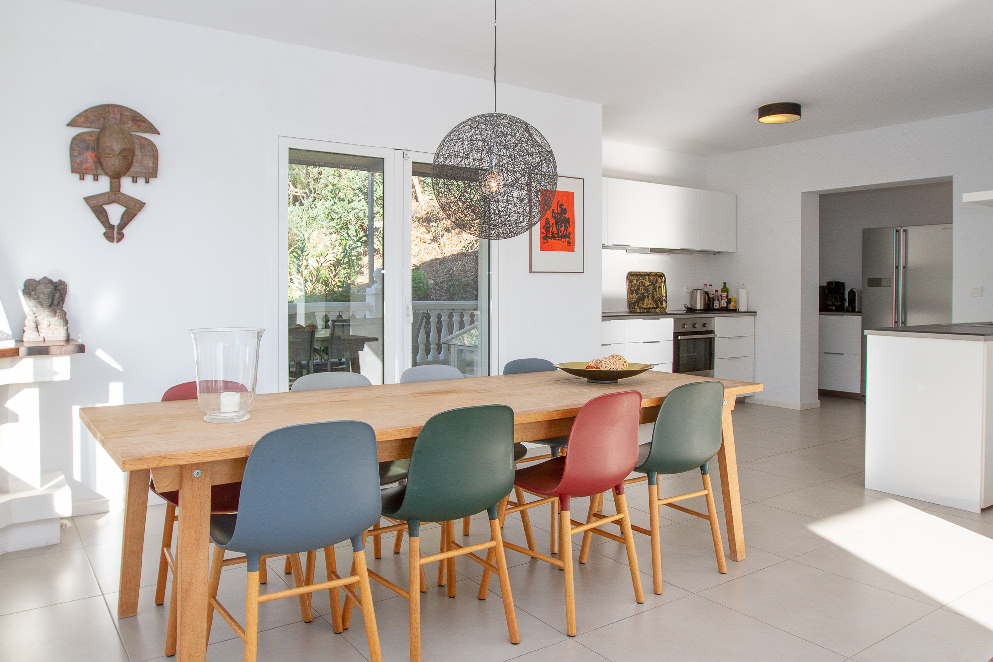 From the entrance you enter directly into a large living room with dining table and cosy sofa area. From the living room you have direct access to an open and fully equipped kitchen. The living room is nicely furnished and has direct access to terraces on both sides of the villa.