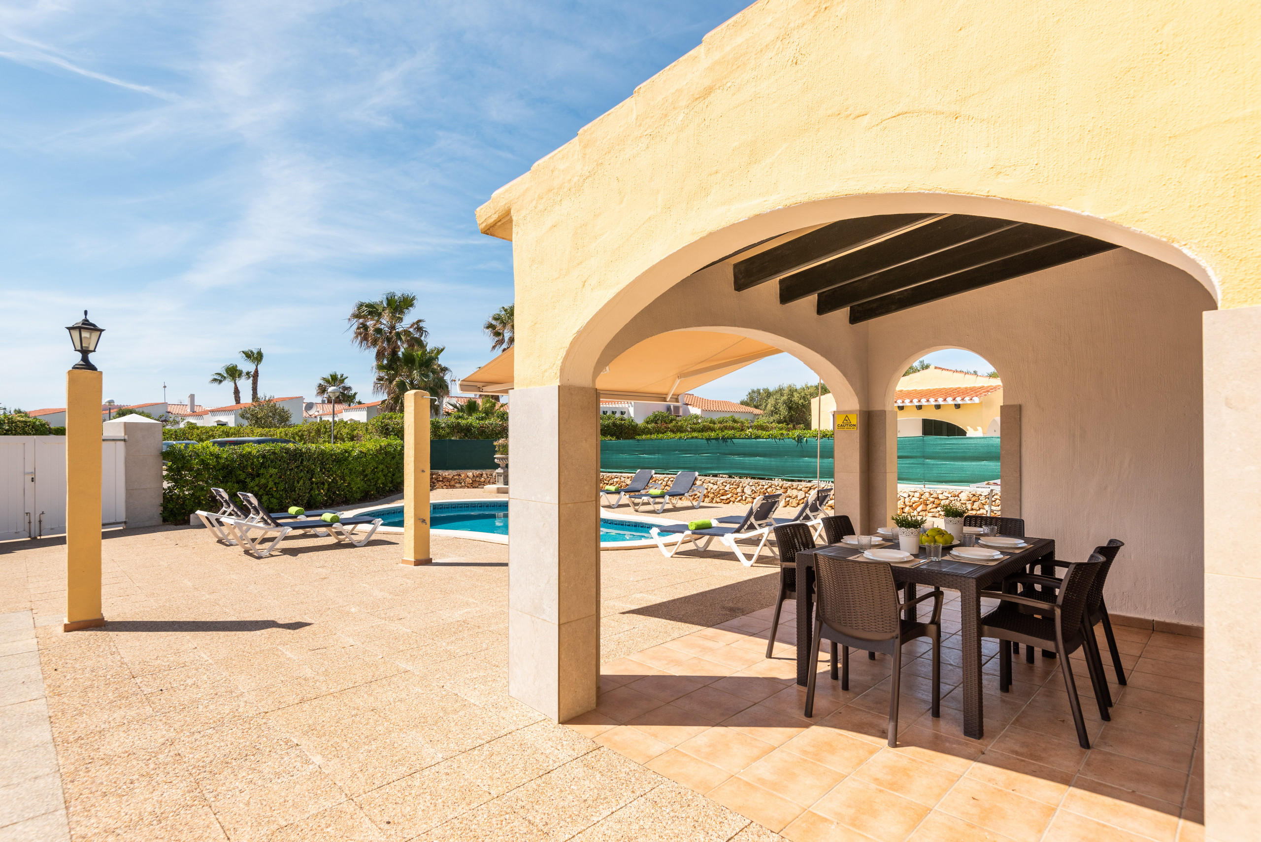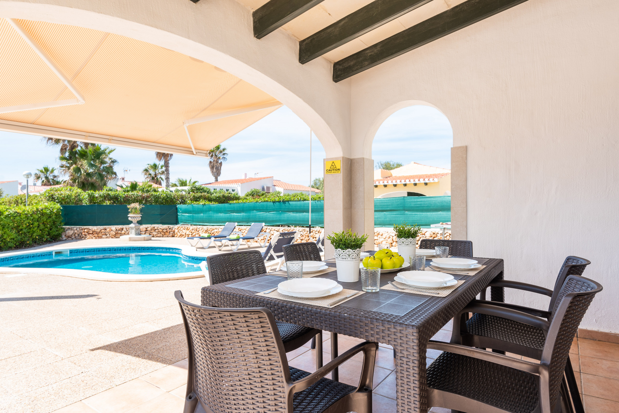 Ideal for families and enjoy the summer! Villa on the ground floor, with 3 double bedrooms with air conditioning and heating, 2 bathrooms, living room, kitchen, fully equipped and furnished. Venus, has a private pool, private barbecue, outdoor lawn garden area - And of course, and for your peace of mind, FREE WIFI, so you can stay connected with yours, send photos of the experience and your vacation , etc. This 2021, we have added an awning on the terrace, so that we protect you more from the sun on the hottest days. Venus, fantastic for relax and for your best holidays in Menorca!