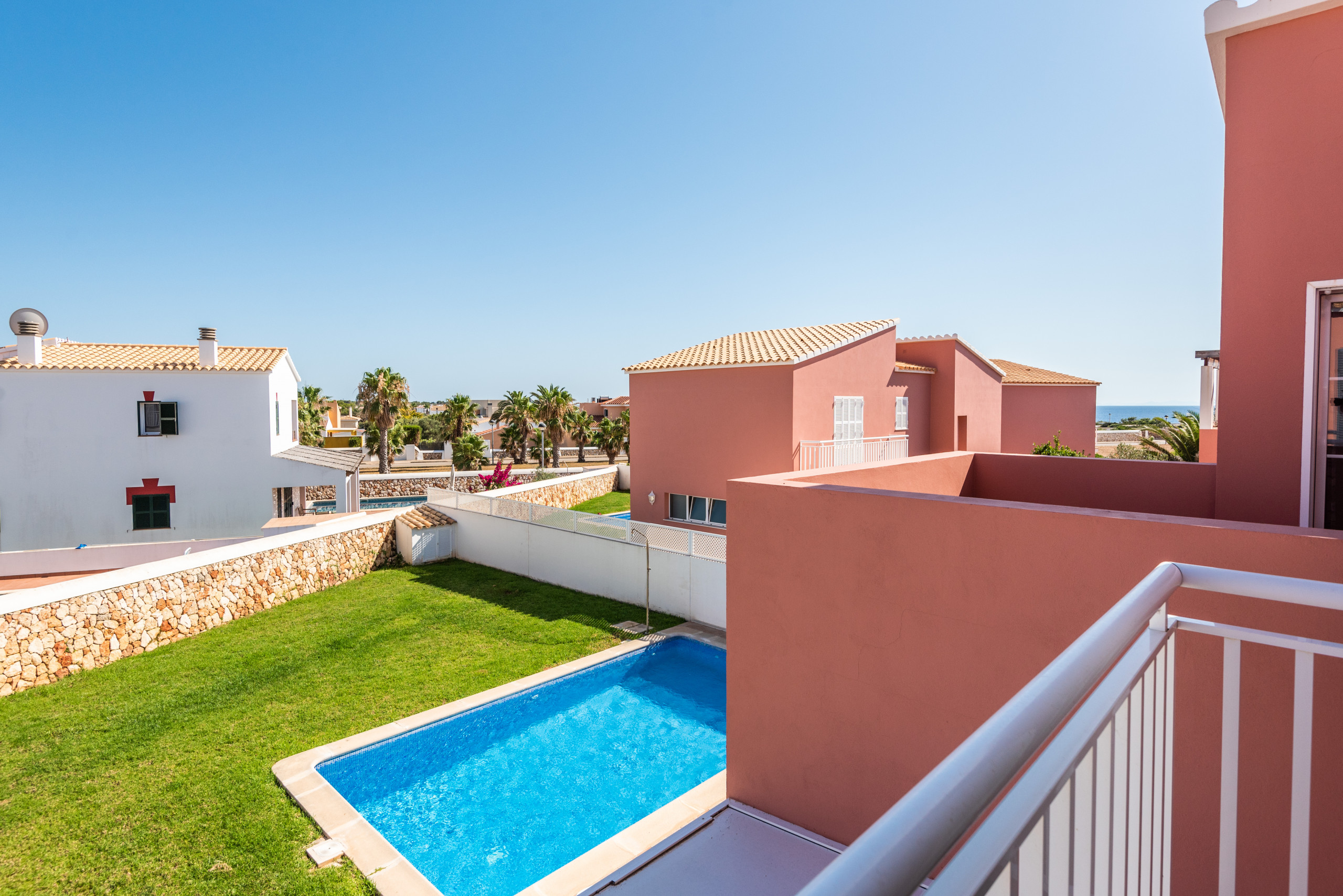 Villa Bay, distributed over 2 floors, with 3 bedrooms (2 with air conditioning and 1 with fan), ground floor with living room and fully equipped independent kitchen. Large outdoor lawn area, wonderful, and beautiful pool where you can enjoy a swim. It has a portable barbecue, in case you want to have a barbecue with the family. You have the great luck of being 1 km from Ciutadella, with access bordering the sea, to be able to enjoy a walk towards Ciutadella, seeing the Mediterranean.