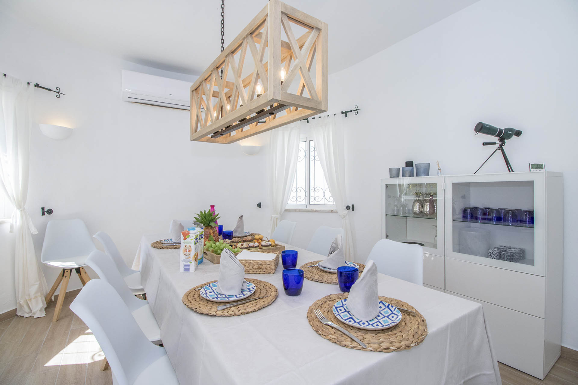 The living room is bright and with direct access to an outdoor seating area with stunning views, Internet (WI-FI), sound system, TV with English spoken channels, air conditioning. The indoor dining area is suitable for 10 people, fully equipped.