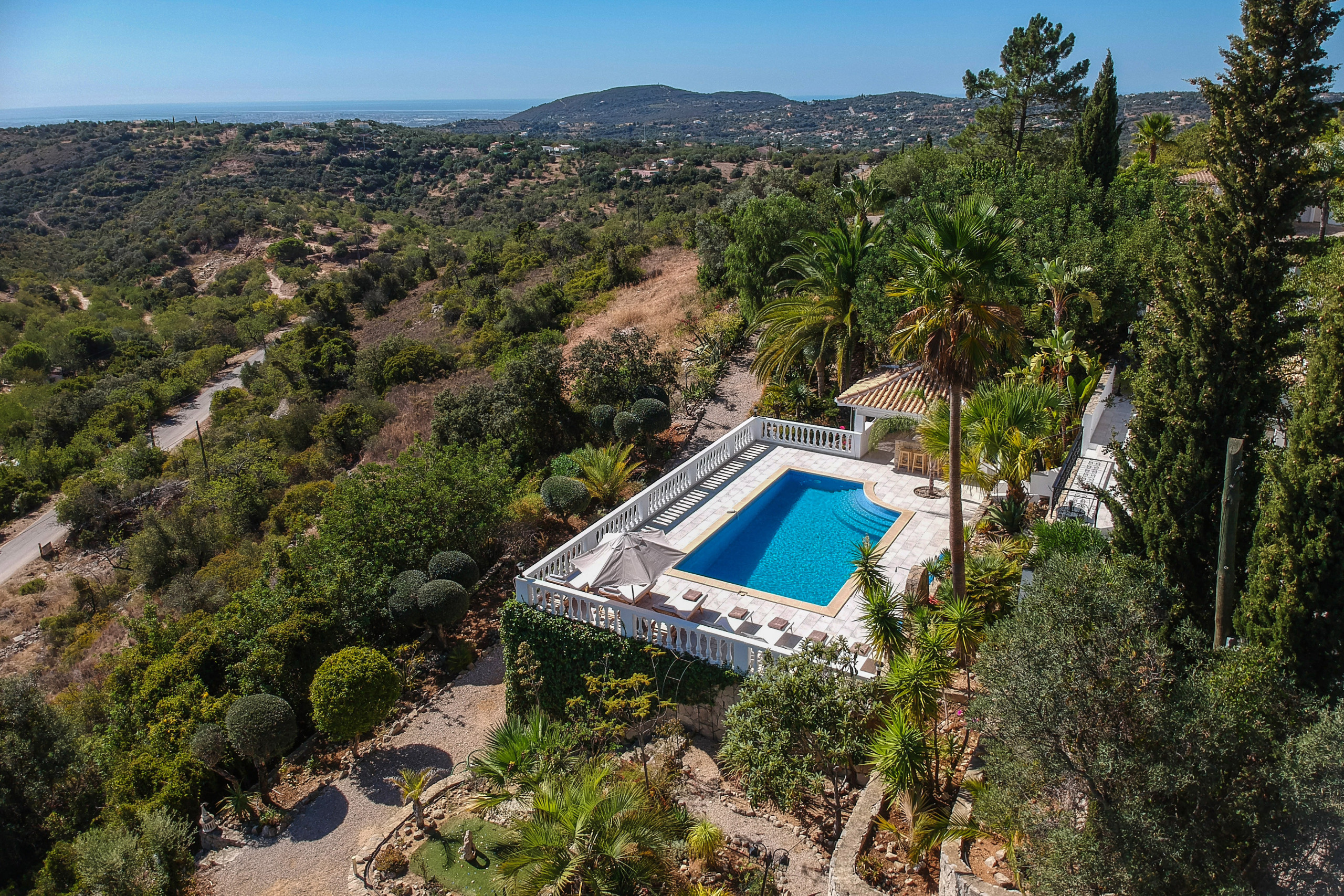Caribe House is an isolated, spacious retreat in a very quiet rural area surrounded by nature, with extensive mountain and Algarve coast views. Just 15 minutes from Faro Airport and 20 minutes from Vilamoura, Faro or Olhão – ideal for peace and quiet (car essential, not for walkable nightlife). Picture yourself enjoying 180º sunset views from the private pool, relaxing in shaded outdoor lounges, or dining al fresco with the gas BBQ. Perfect for large families or friend groups of up to 10.