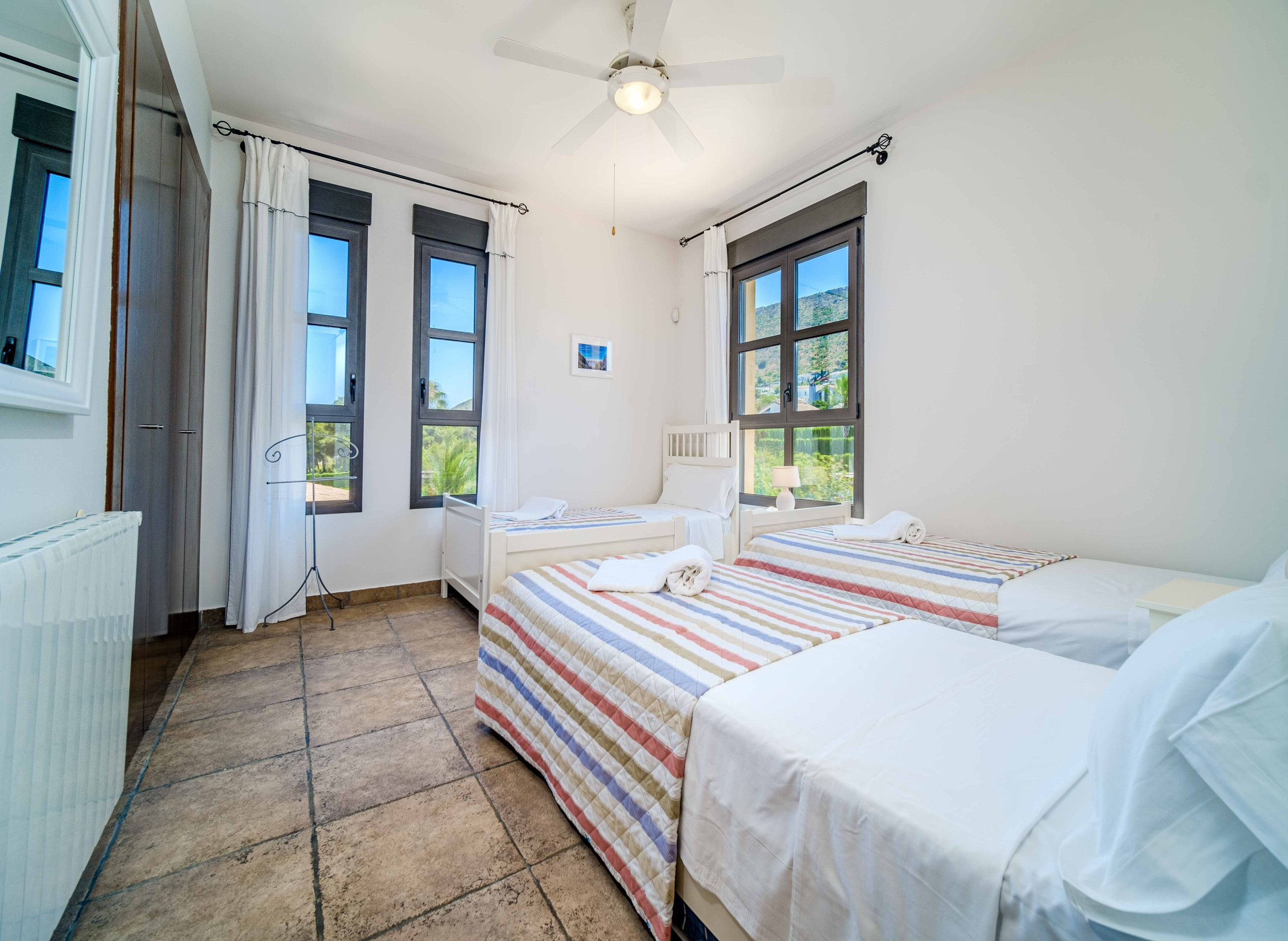 The first of the three bedrooms is located on the ground floor and offers direct access to the kitchen and outdoor areas. A double bed and an en-suite bathroom ensure that you can find your refuge in this villa. Upstairs, guests are offered two other beautiful rooms, one with three single beds and another with a double bed. Both rooms have ceiling fans to cool down in the warm climate, and both share a beautiful bathroom!