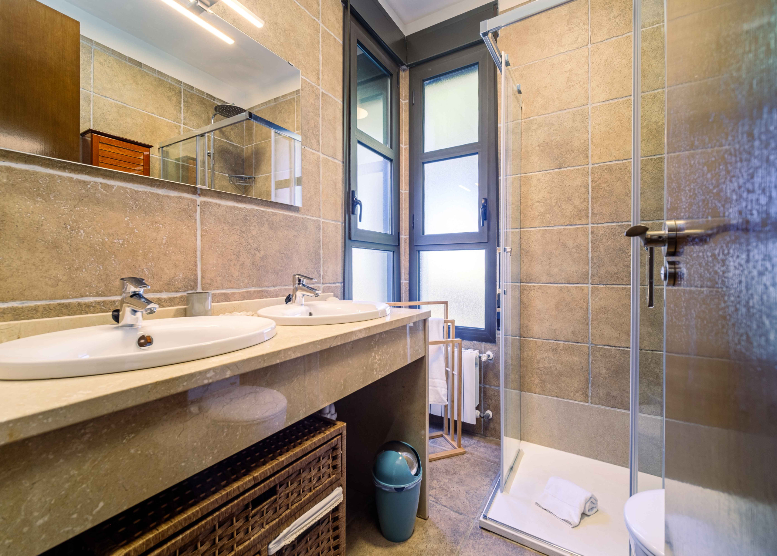 Located on two floors, Villa Abaesko offers a charming open-plan living room and dining room where groups and families have enough space to gather and enjoy time together. Meals can be served in this area, and the elegant dining table makes it an excellent place for more formal meals. The spacious living room behind the dining room offers sofas to relax, with movies on the wall-mounted cable TV! A guest bathroom is located on this floor, which also houses the kitchen. Fully equipped, it offers an electric oven, microwave, dishwasher, refrigerator, coffee maker, kettle and toaster, and a comfortable table and chairs located next to a window with beautiful views of the outside.