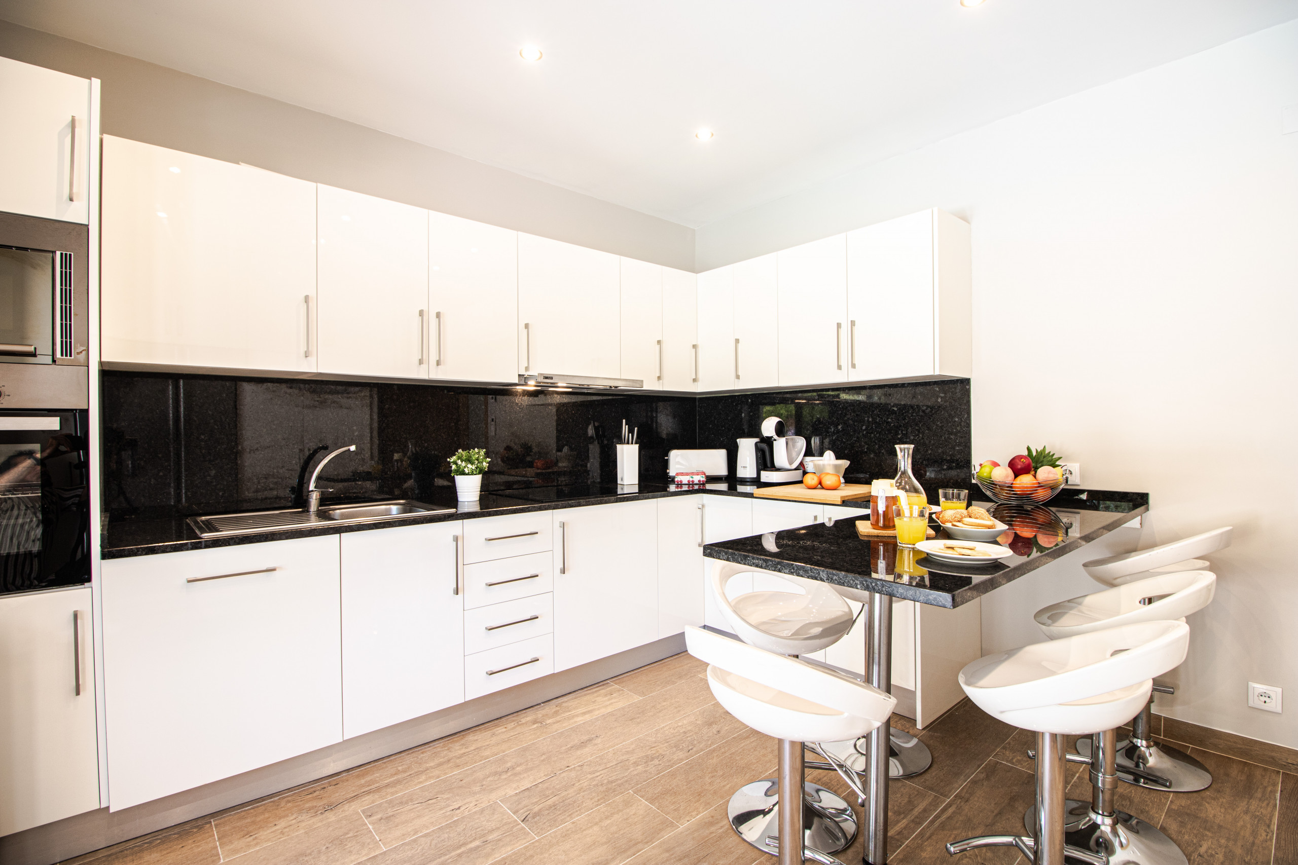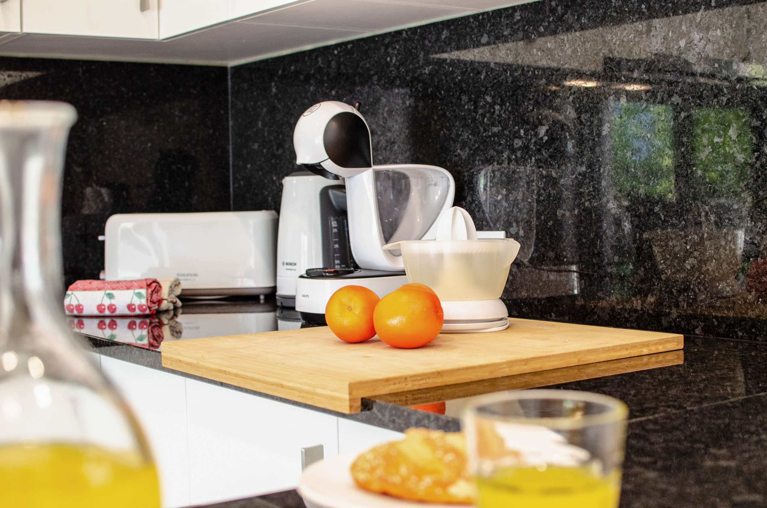 The kitchen is fully equipped with direct access to an outdoor dining area, very private, suitable for 6 people, with charcoal BBQ and plenty of shade.