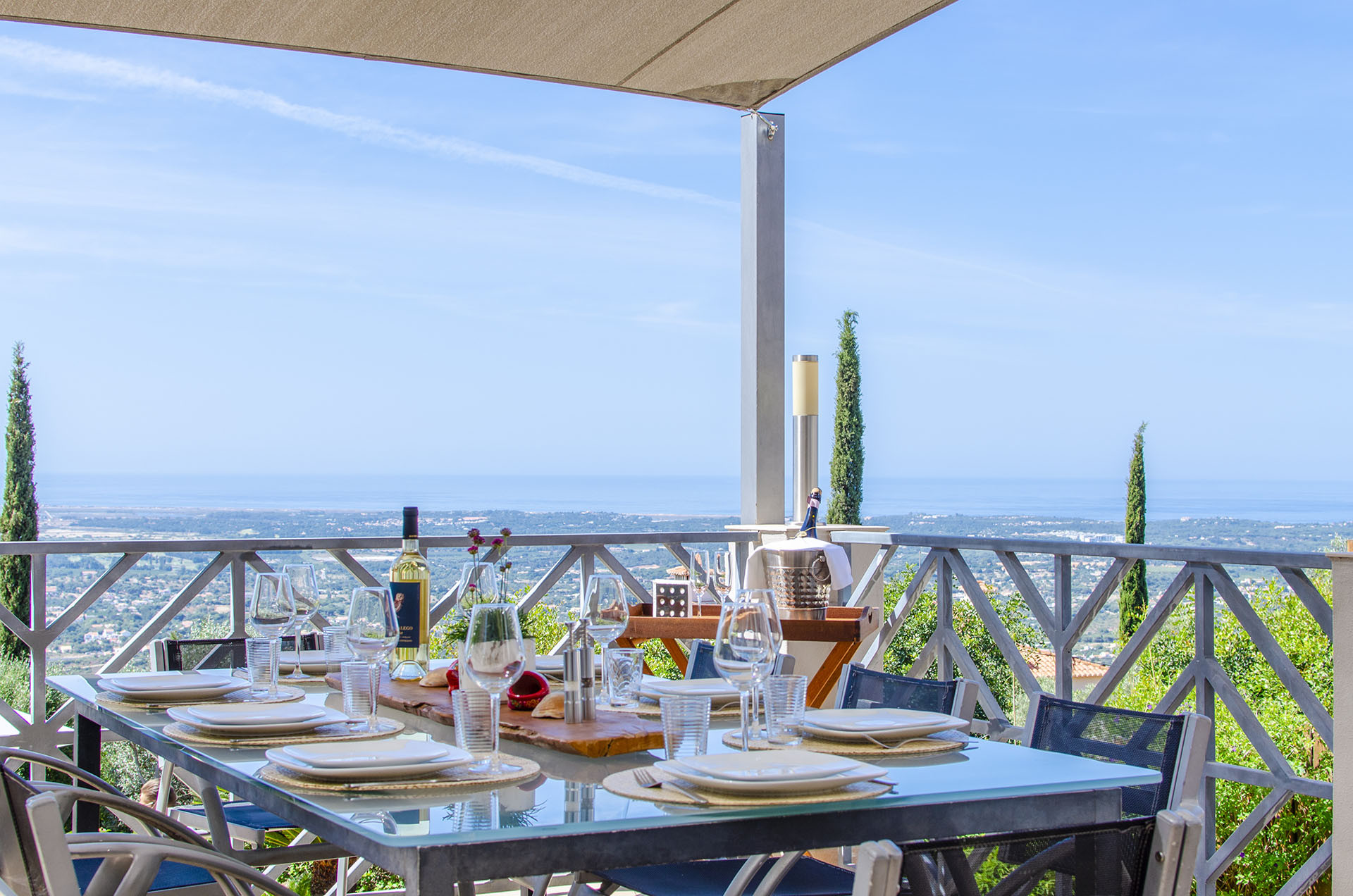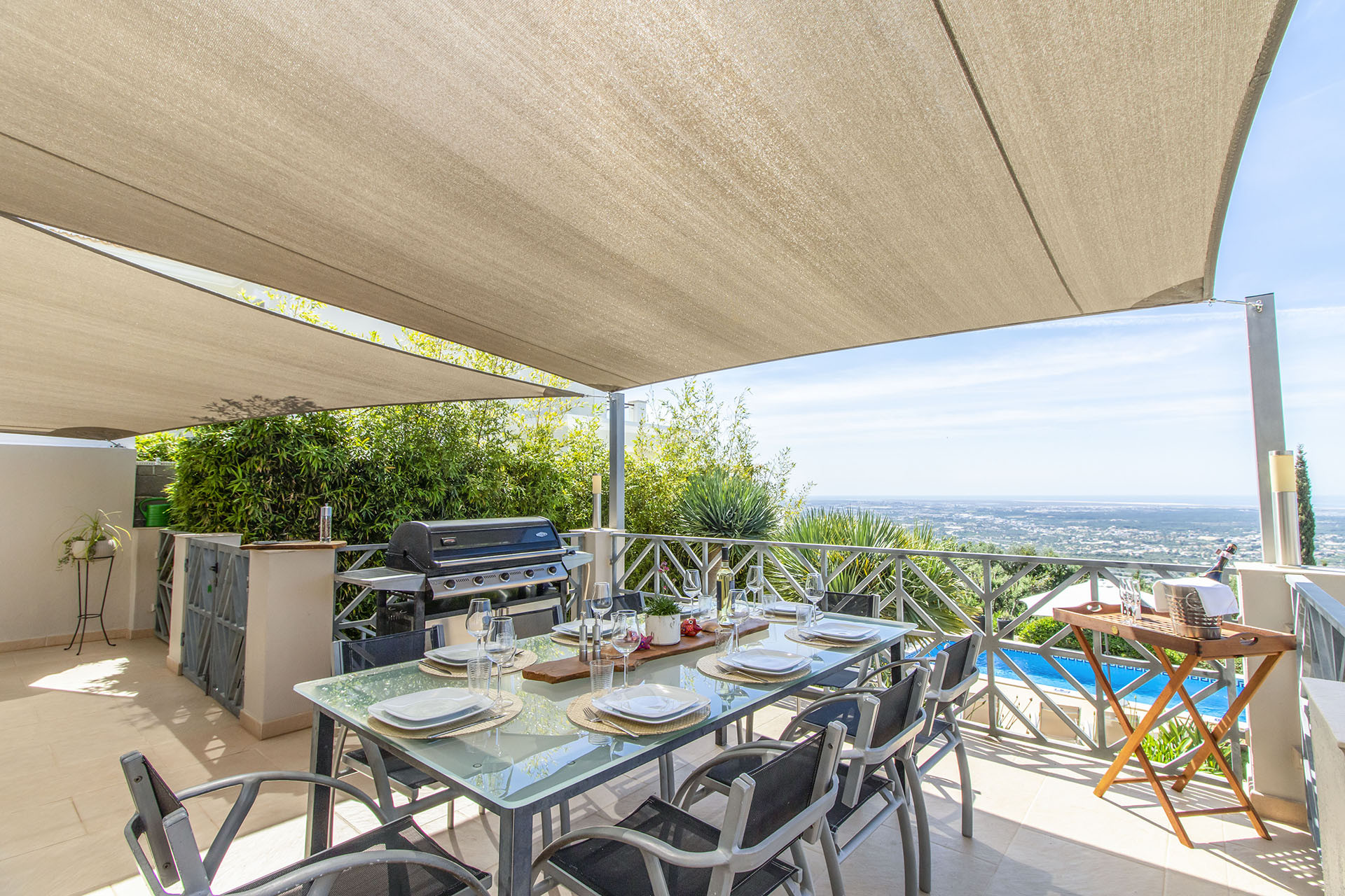 The whole plot is fenced by walls and hedges. On the terrace that runs along the bedrooms and the living room there’s a gas BBQ and an outdoor table with 8 chairs, protected from the sun by a shade sail to allow outdoor meals even during the day, always picturing a splendid view come night or day.