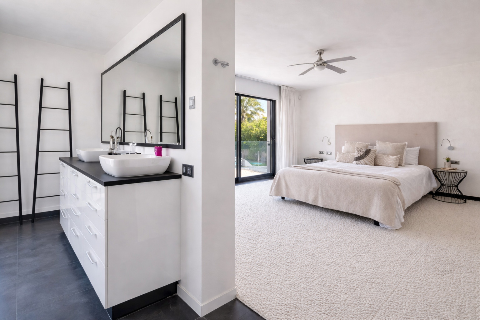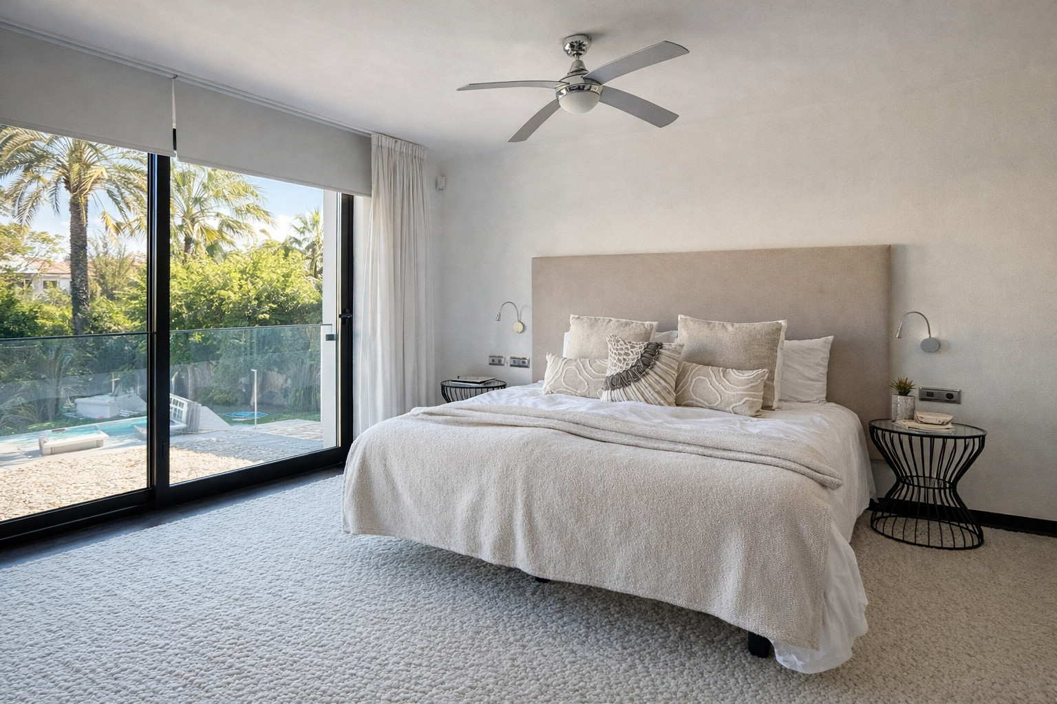3 bedrooms: Master bedroom on the first floor. Very spacious bedroom with double bed, flat screen TV, walk-in closet, air conditioning, ceiling fan, bathroom en-suite with both shower and bathtub. Balcony and large sliding doors with a unique view to the pool area and the majestic mountains of Marbella.