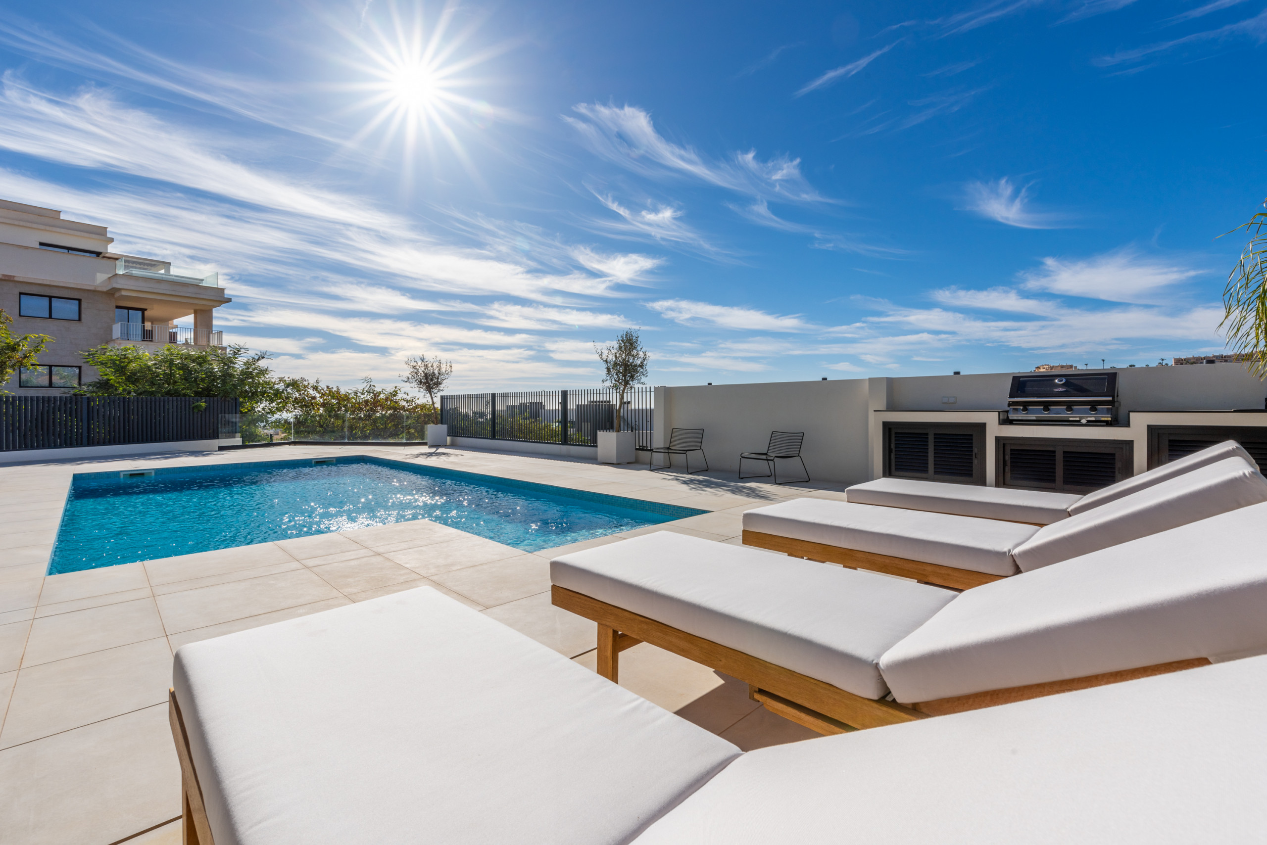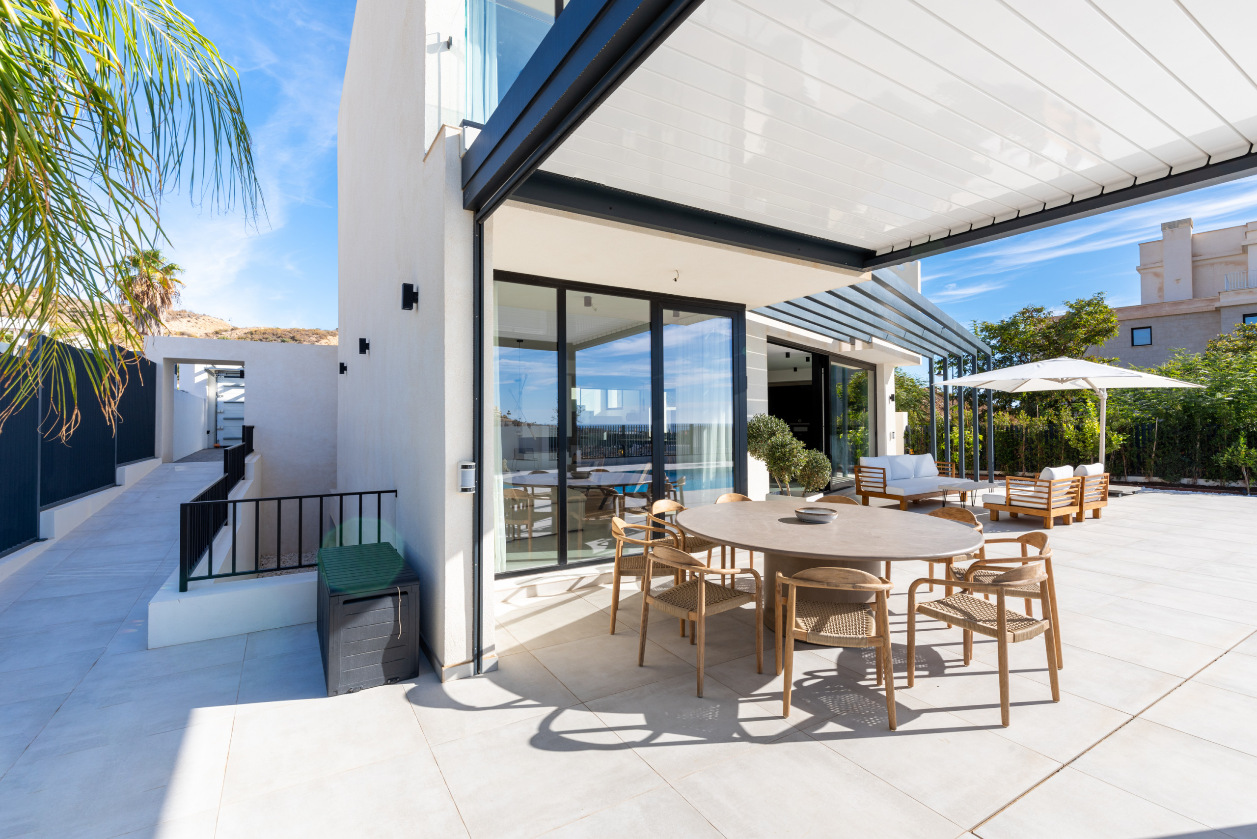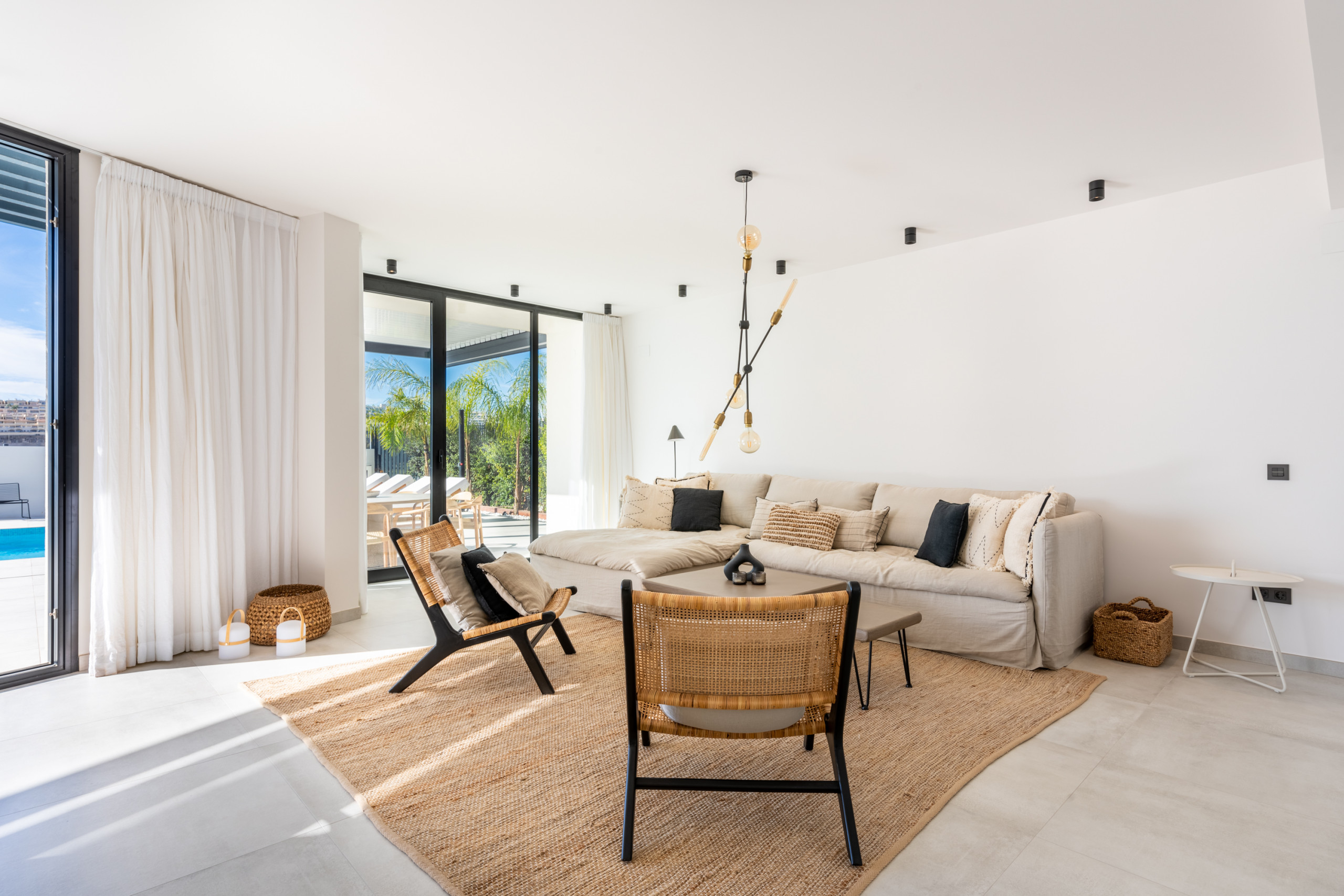 Through the living room, gives access to the main terrace, which is beautifully furnished with dining table, lounging area, sun beds and a fabulous private pool. All this with beautiful views of the Mijas costa coastline.