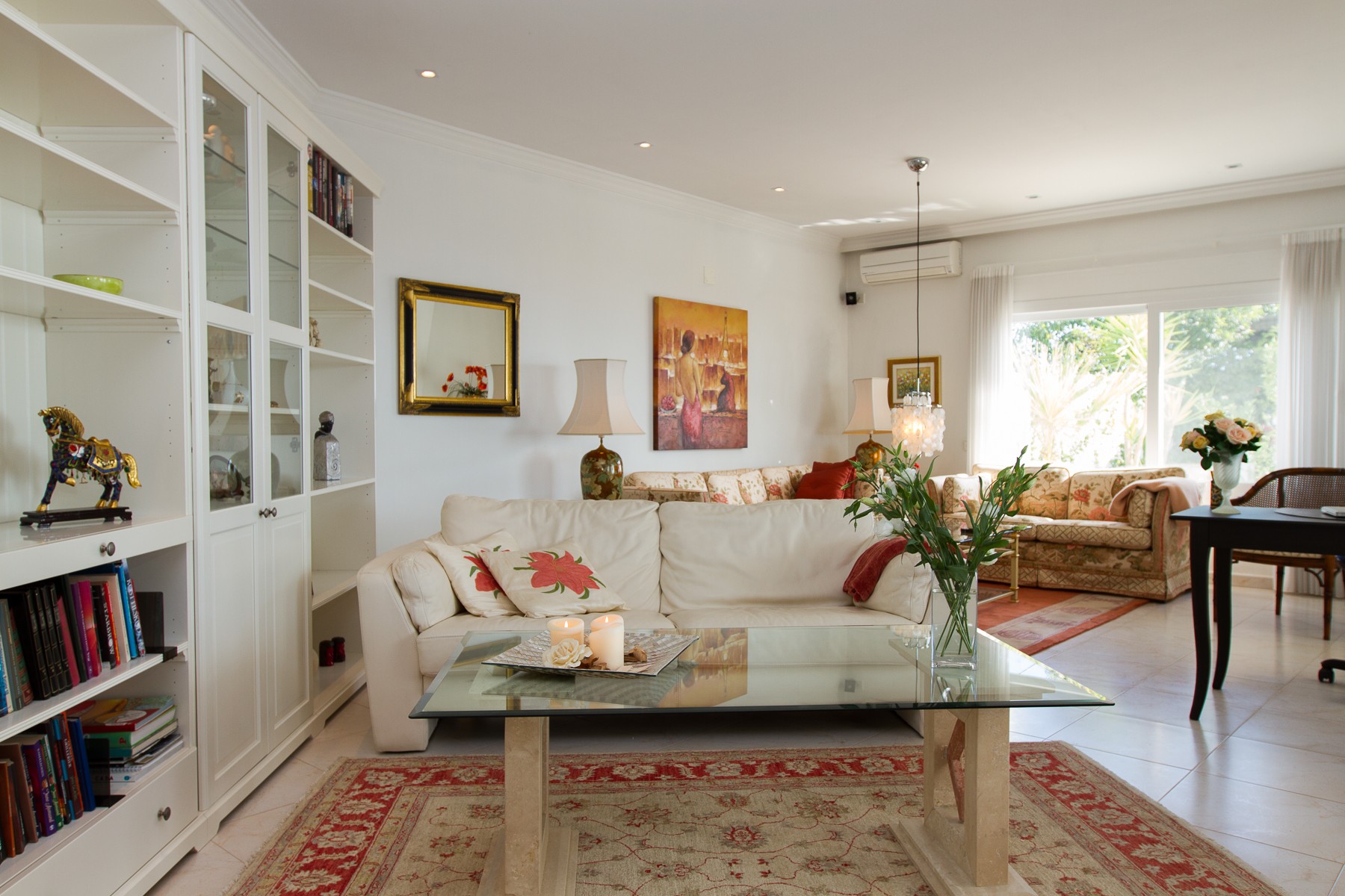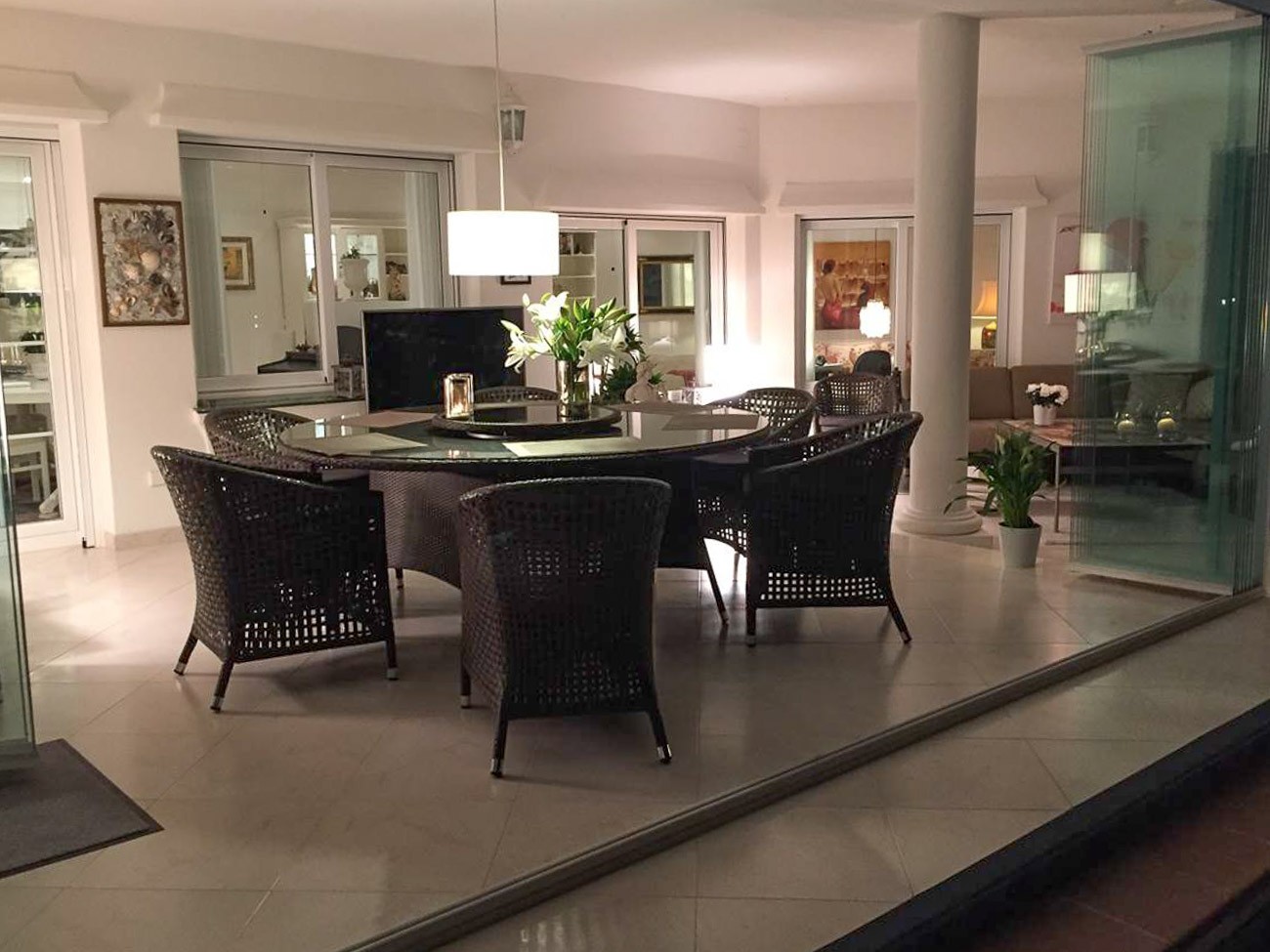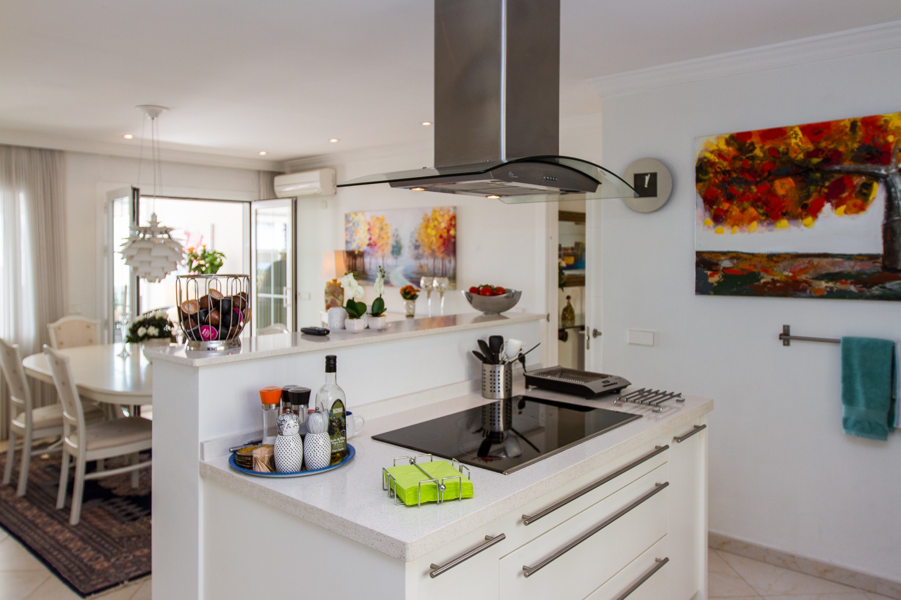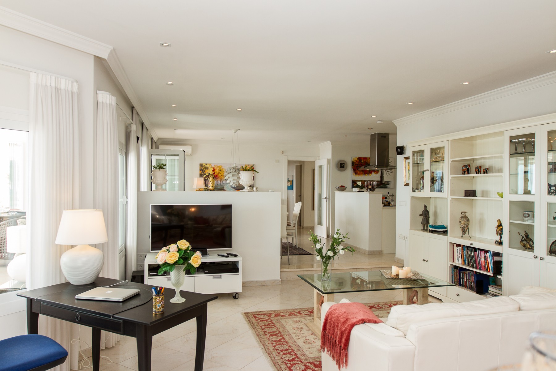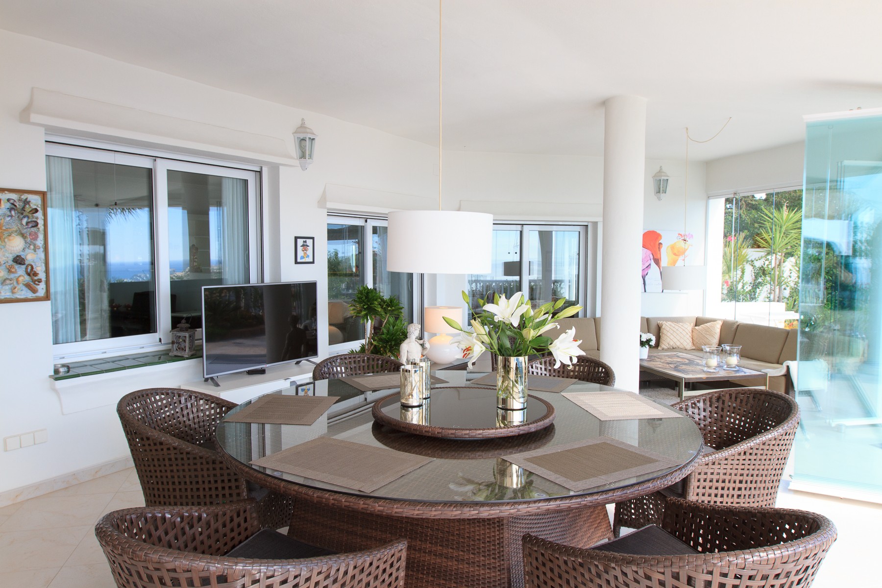 Although the dining room and the living room are very nice, the most will stay on the outside covered terrace with glass walls, which are like an extra room during both winter and summer. The covered patio is furnished just as lovely as the living room with comfortable sitting area, TV, DVD and a round dining table, which offers a compelling view of the Mediterranean and the bay of the village.
