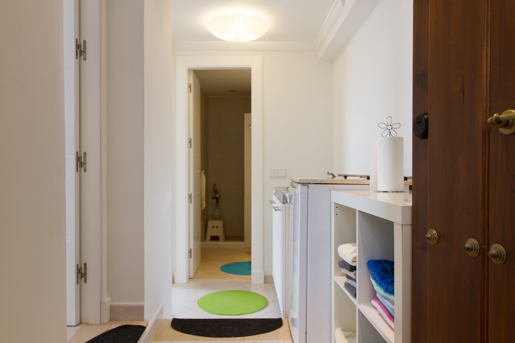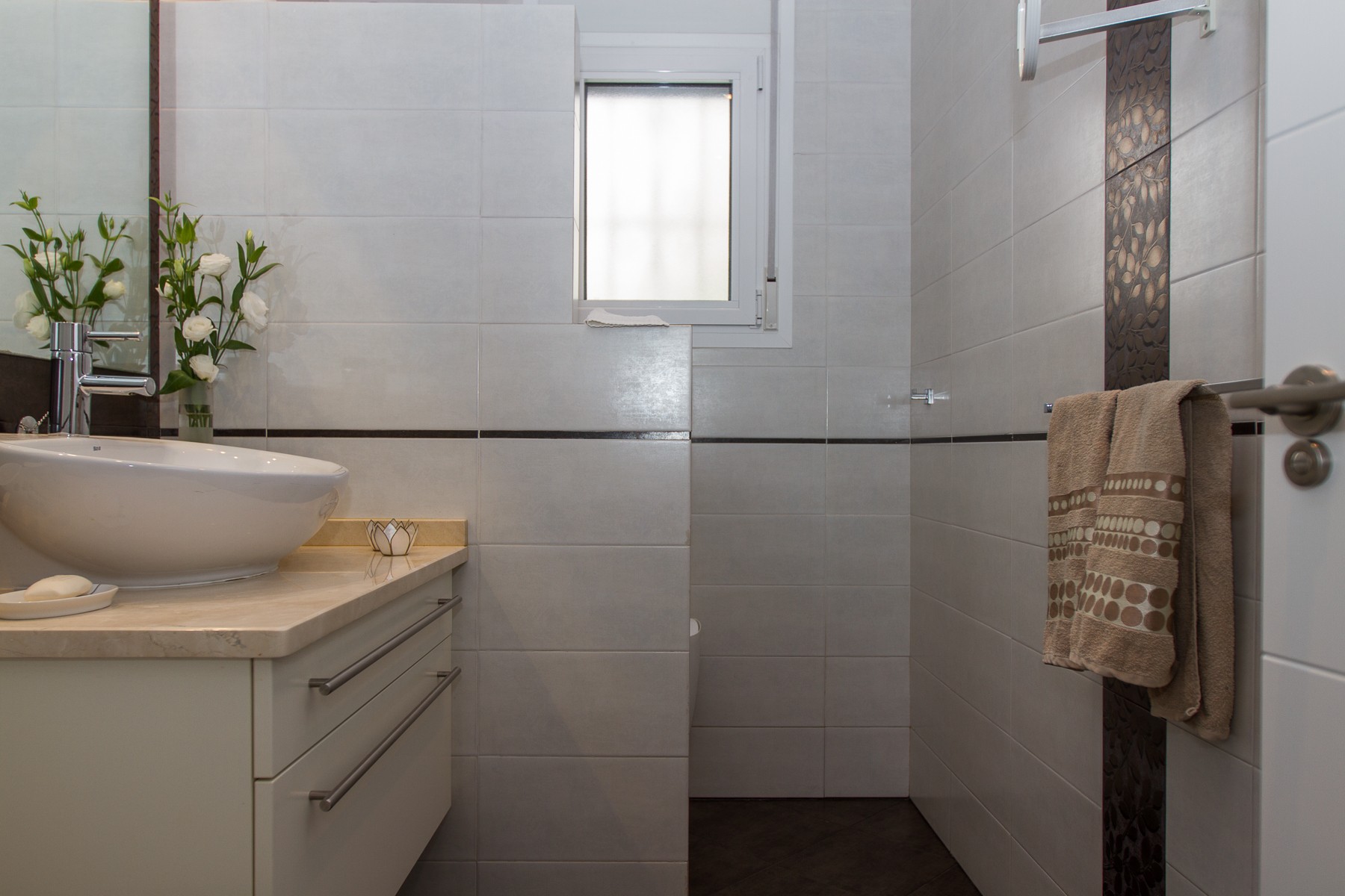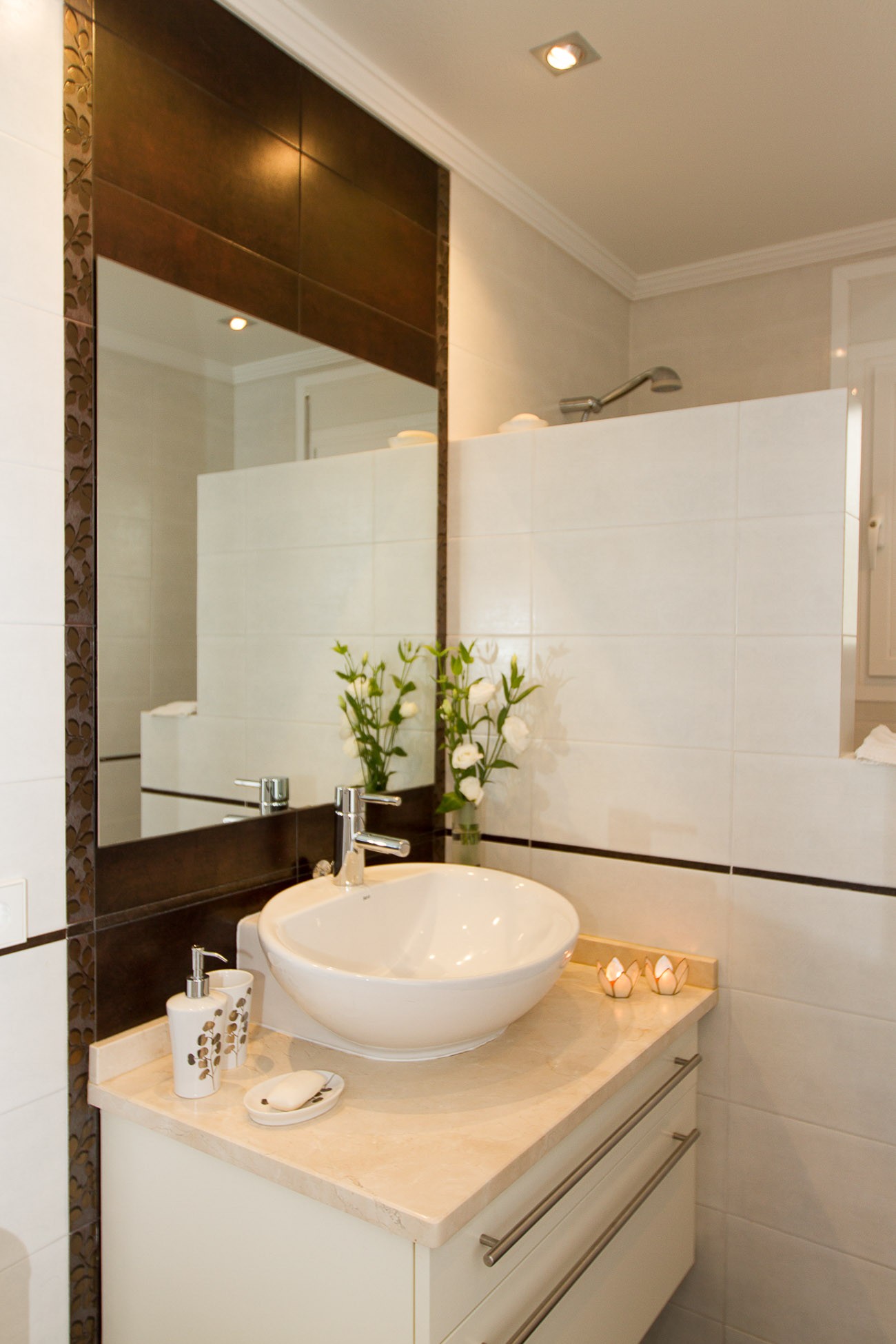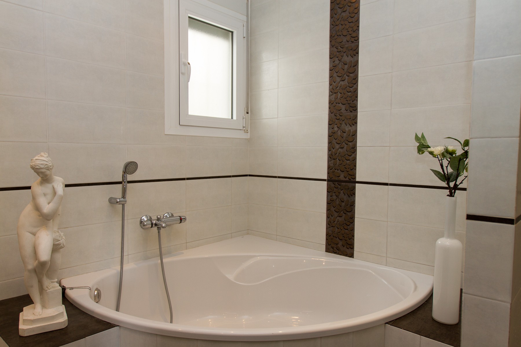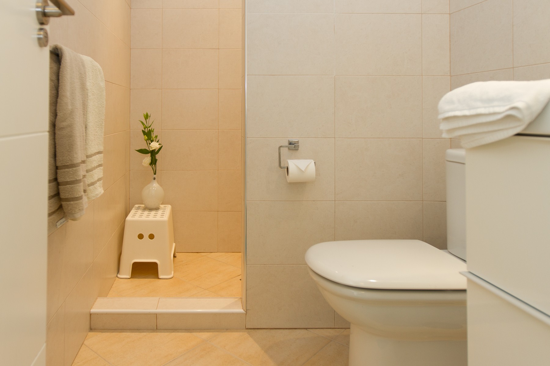 The bathrooms are nice decorated with beautiful natural colored tiles and all have underfloor heating and hairdryers
