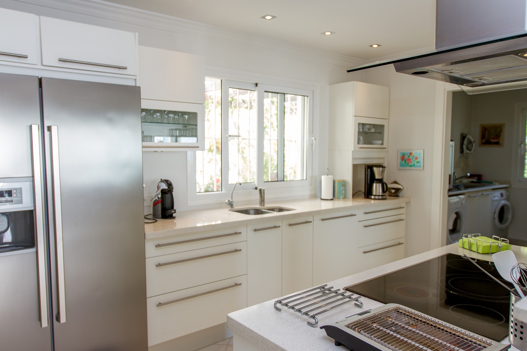 Inside the main villa is a fully equipped kitchen with oven, dishwasher, American fridge with ice cube maker, utility room with washer and tumbles dryer. The kitchen is in open connection with the dining room, which is nicely furnished with dining table with extension plate. The living room is bright and pleasant with comfortable sitting areas, TV, DVD, wireless Internet and air conditioning. Although satellite channels are only on TV in the main house. DVD in anneks.