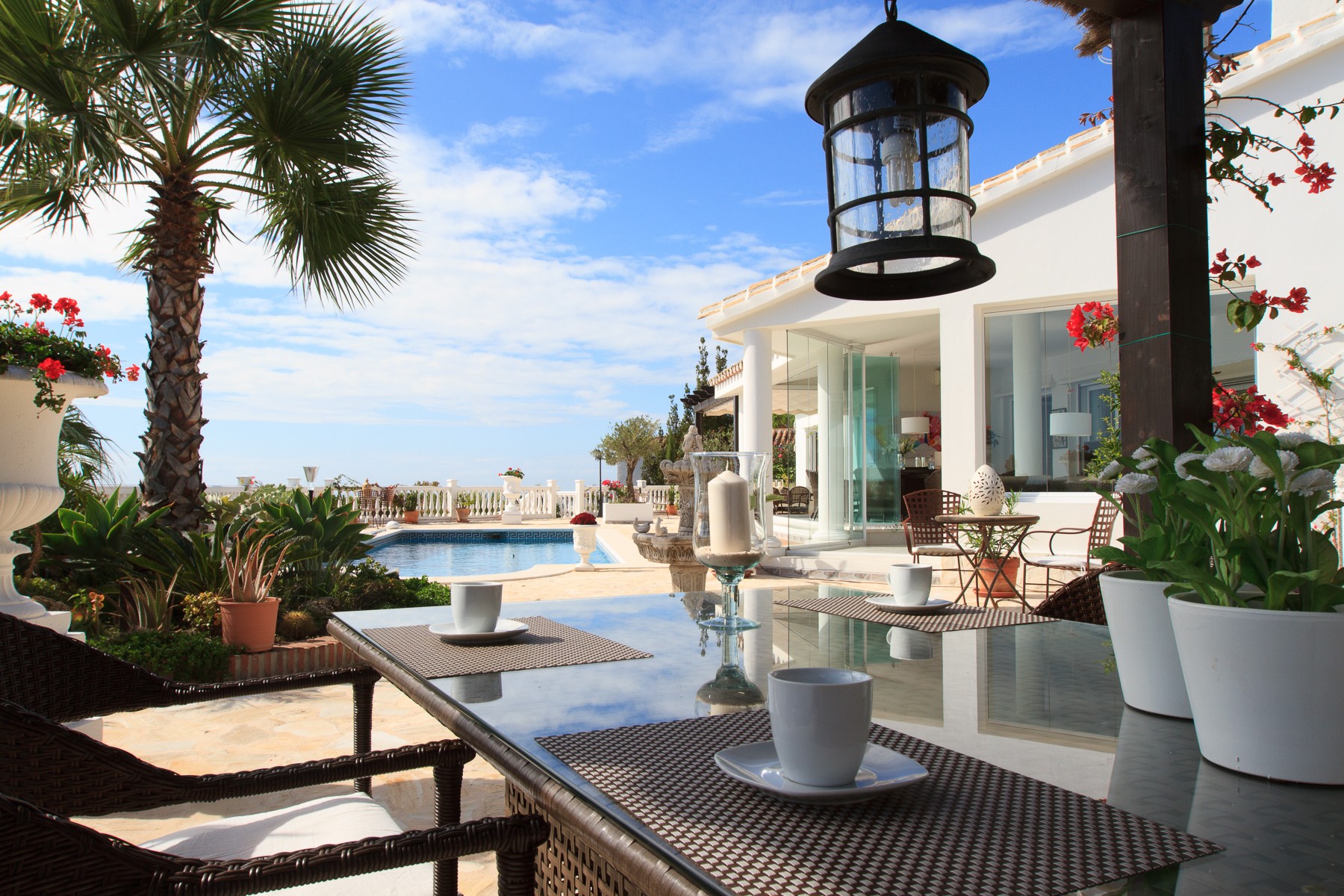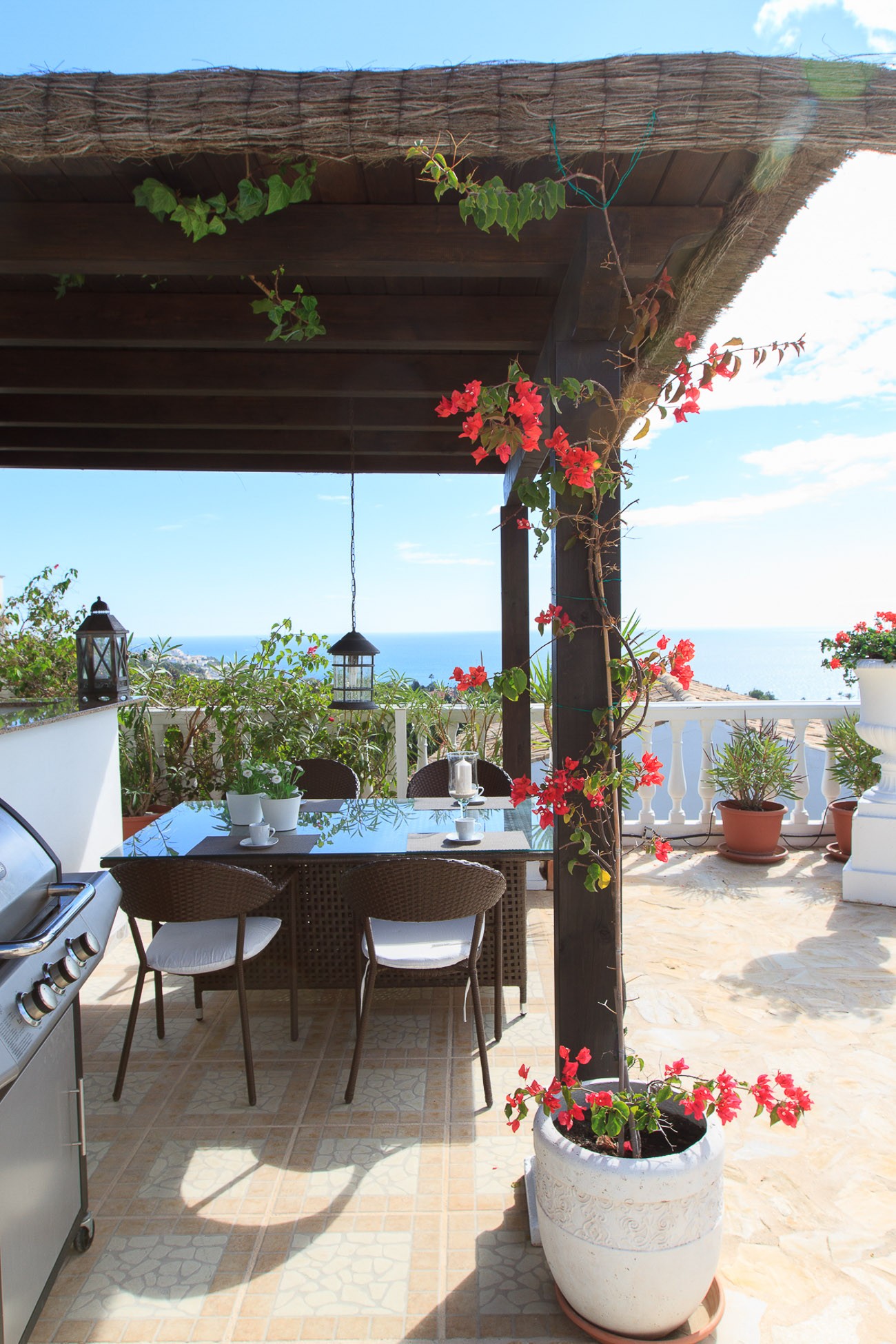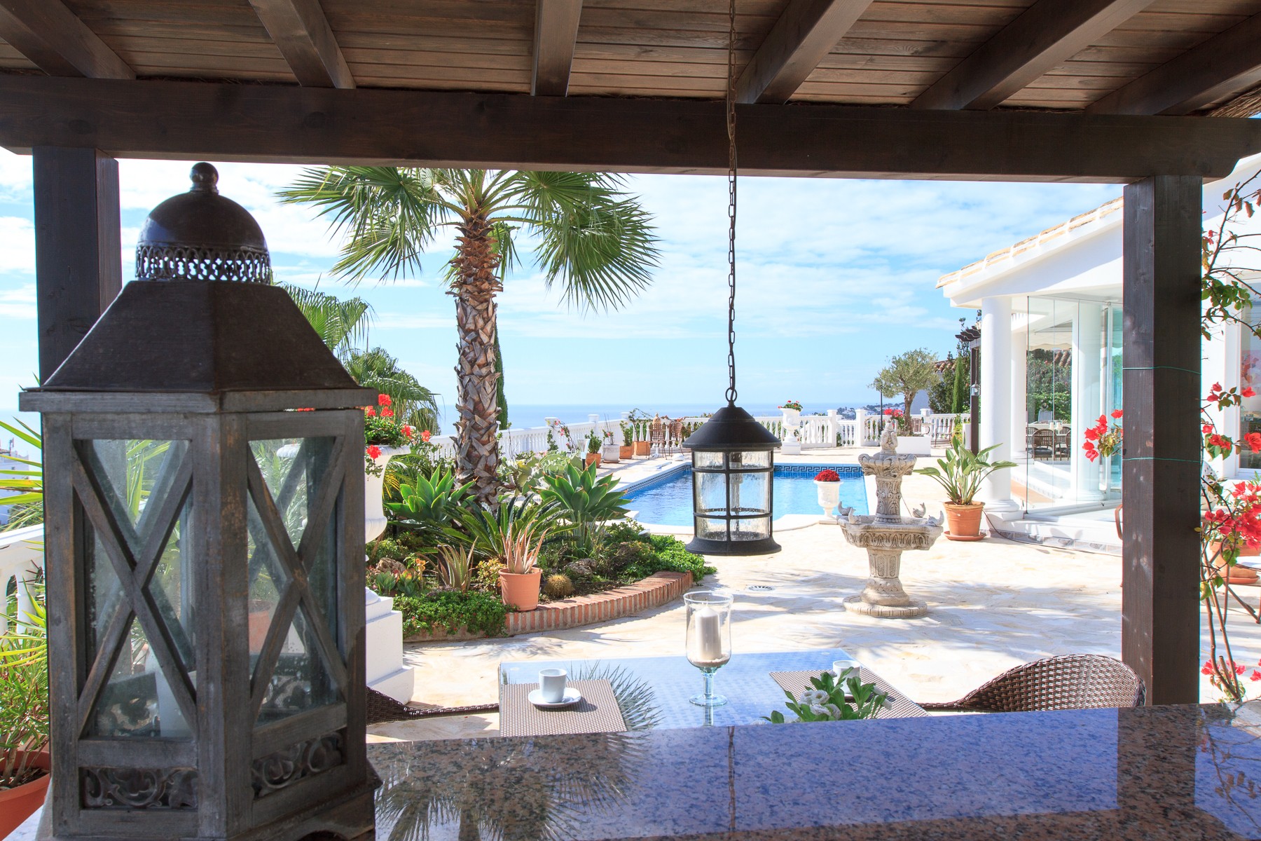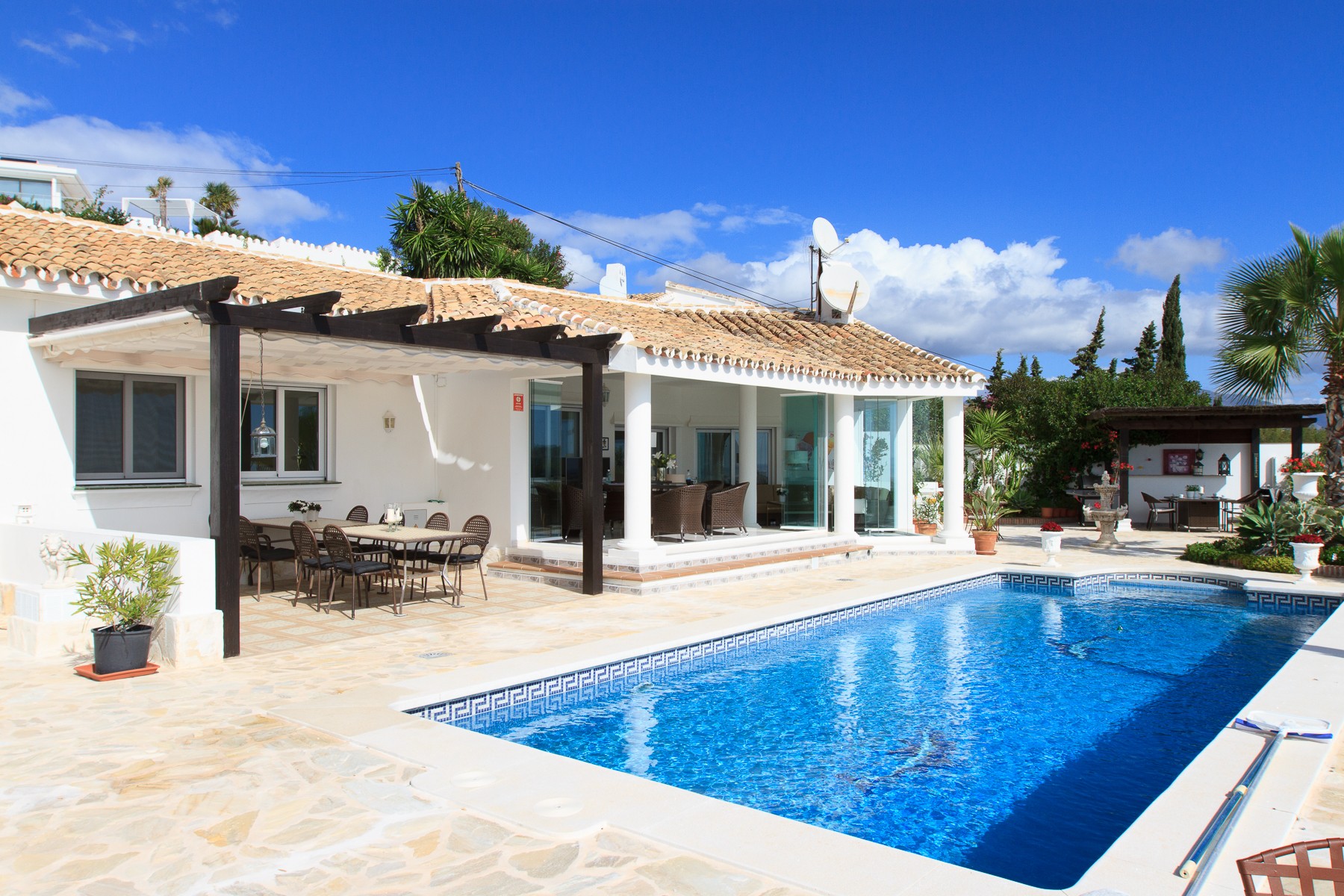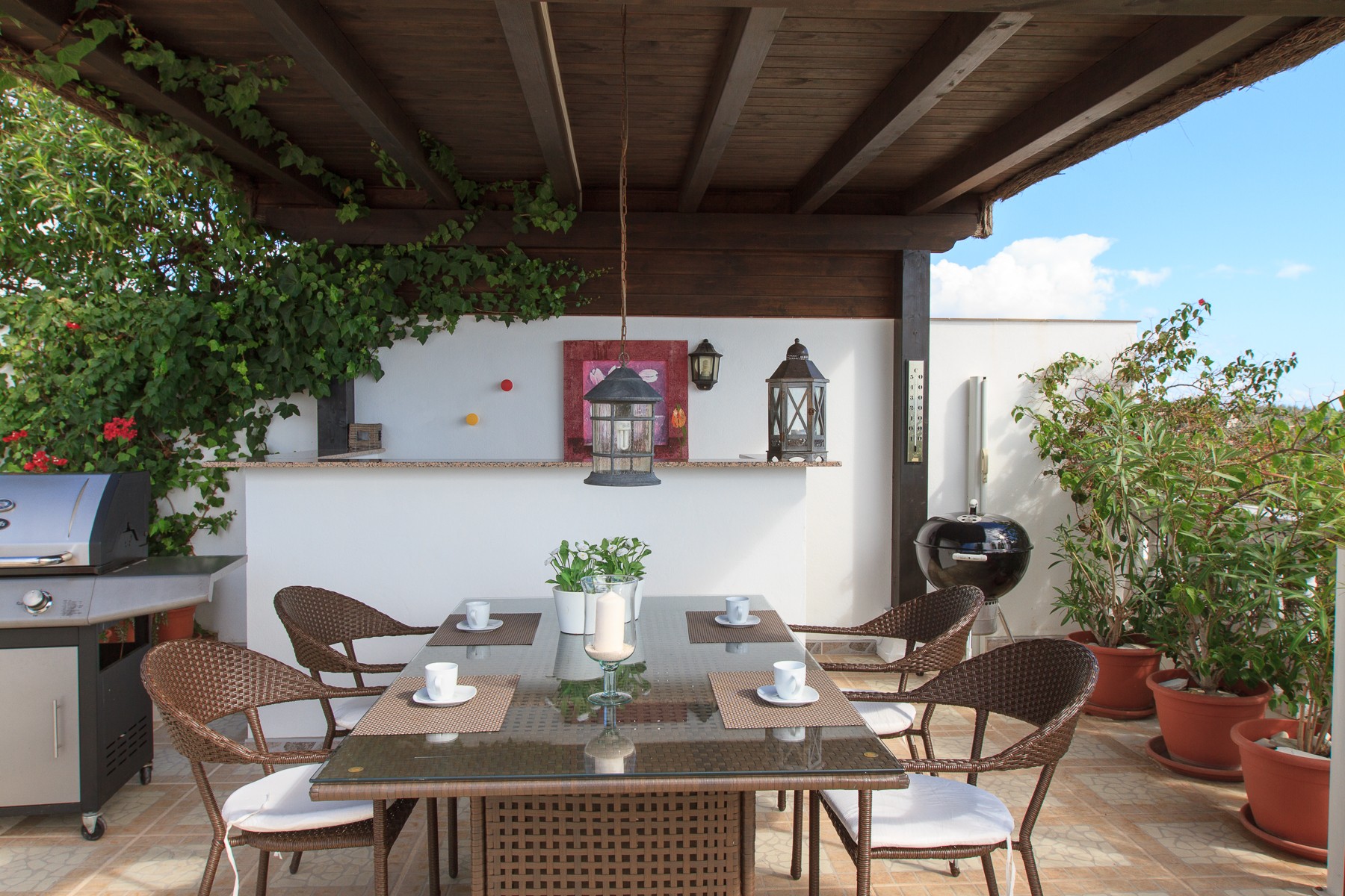 The villa continues to surprise and offer in the exterior even more lovely and convenient facilities. Among other things, there are patio tables and chairs outside each bedroom in the annexe, covered outdoor kitchen with refrigerator, bar, sink, dining table, gas grill and Weber charcoal grill and an area that can provide the scenario for many enjoyable evenings in good company.
