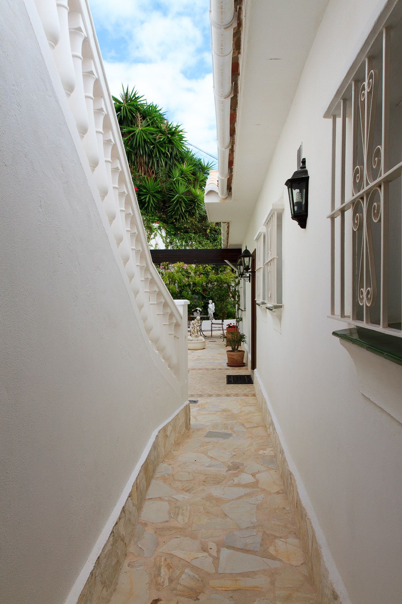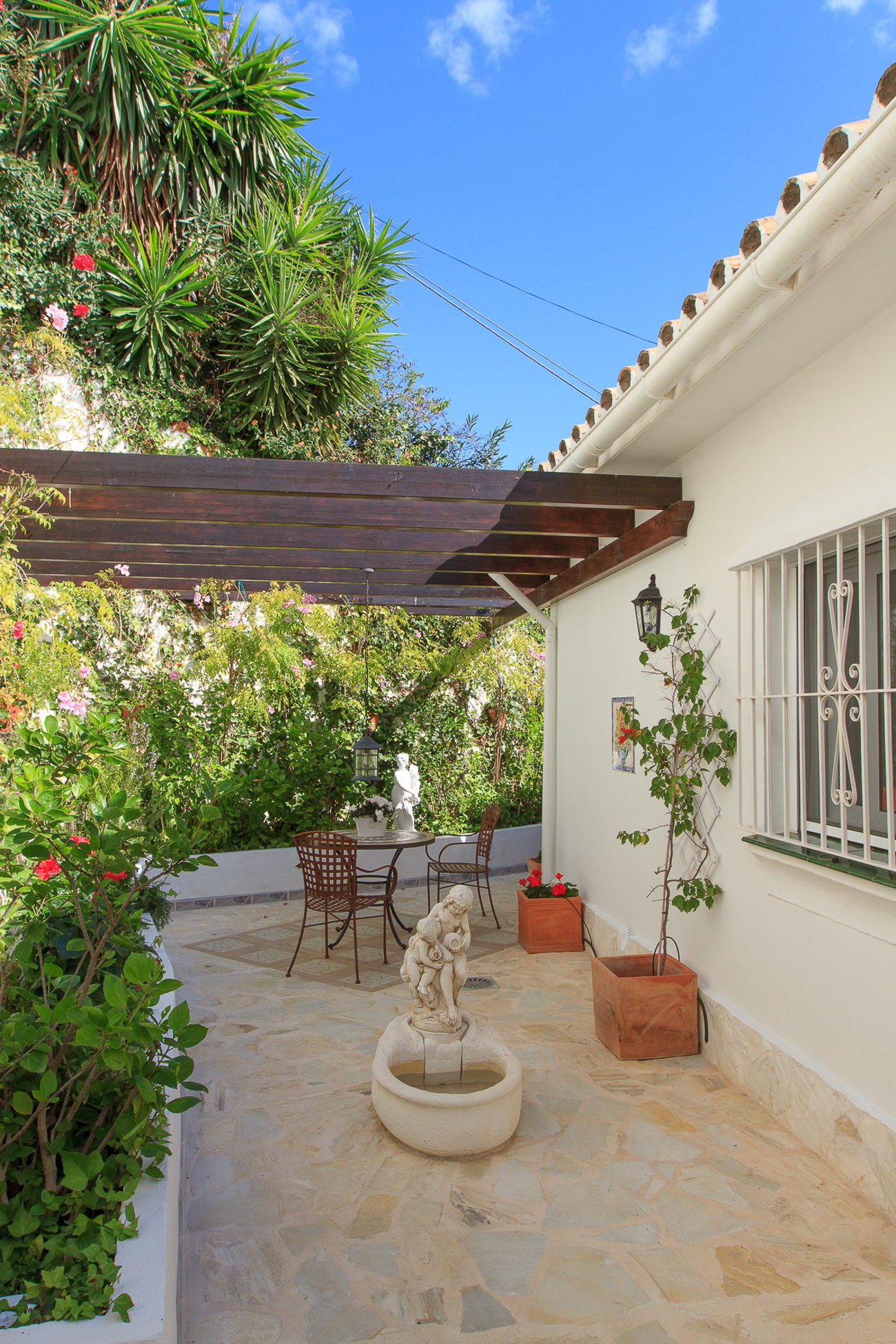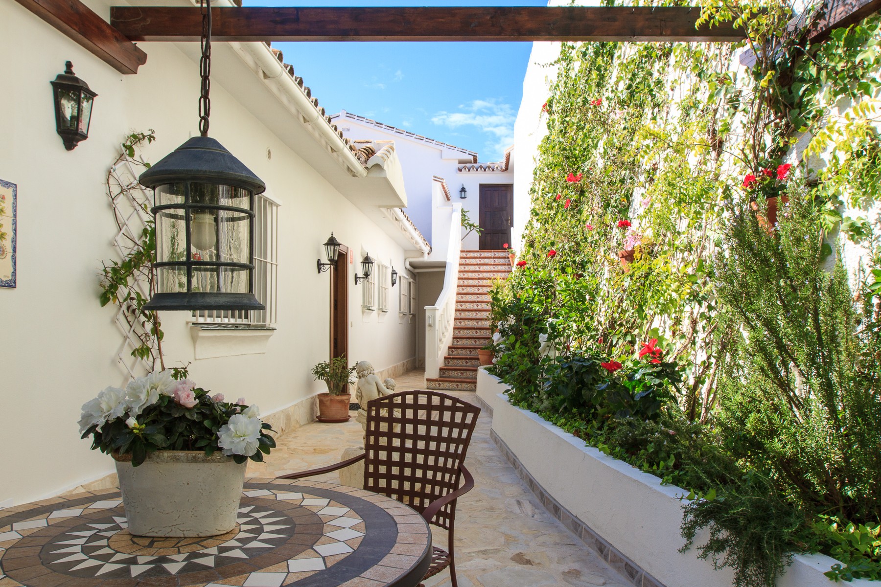 In front of the house is an Andalucian inspired patio with natural stone and a nice sitting area with patio table and chairs where you can enjoy the peace. Natural stones and cosy corners are a theme thorough the entire plot, where there is ample opportunity to relax and enjoy the stay.