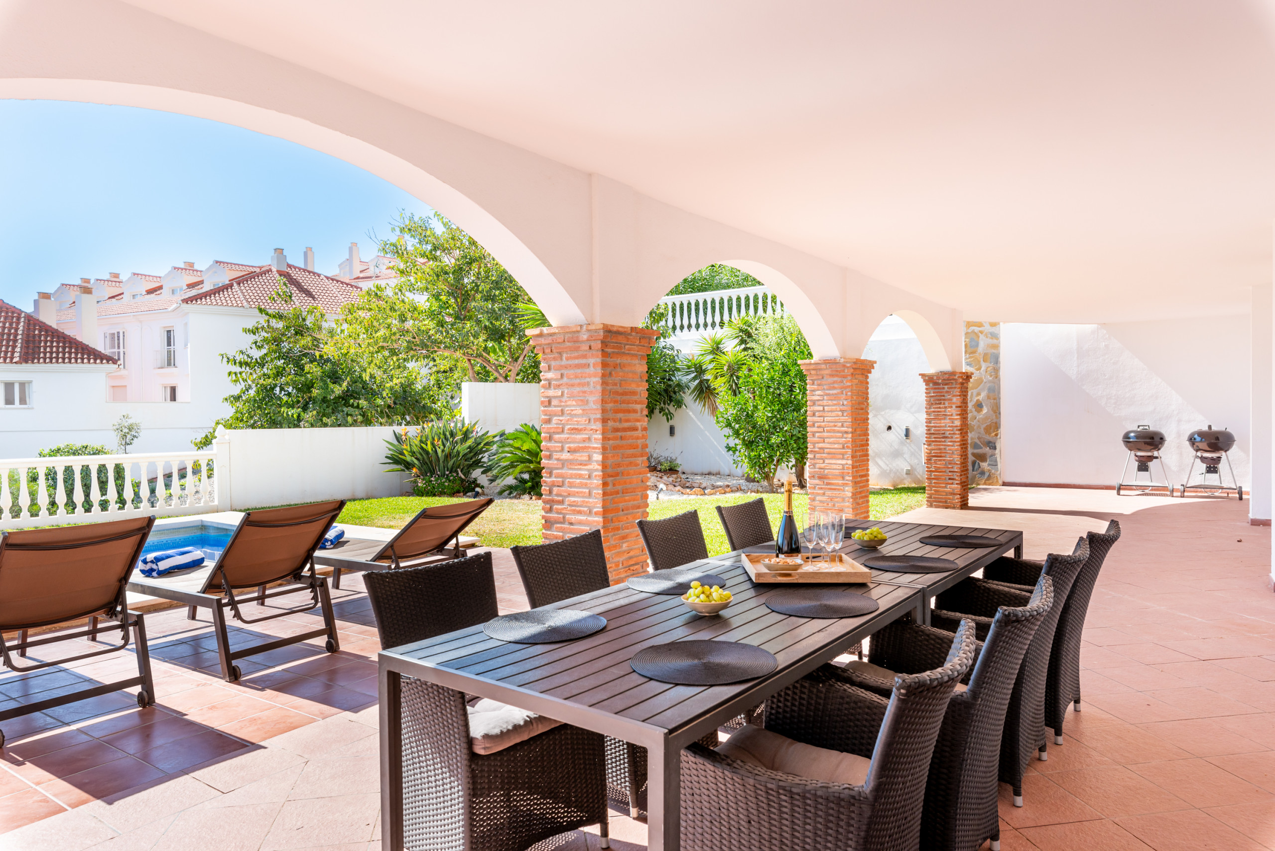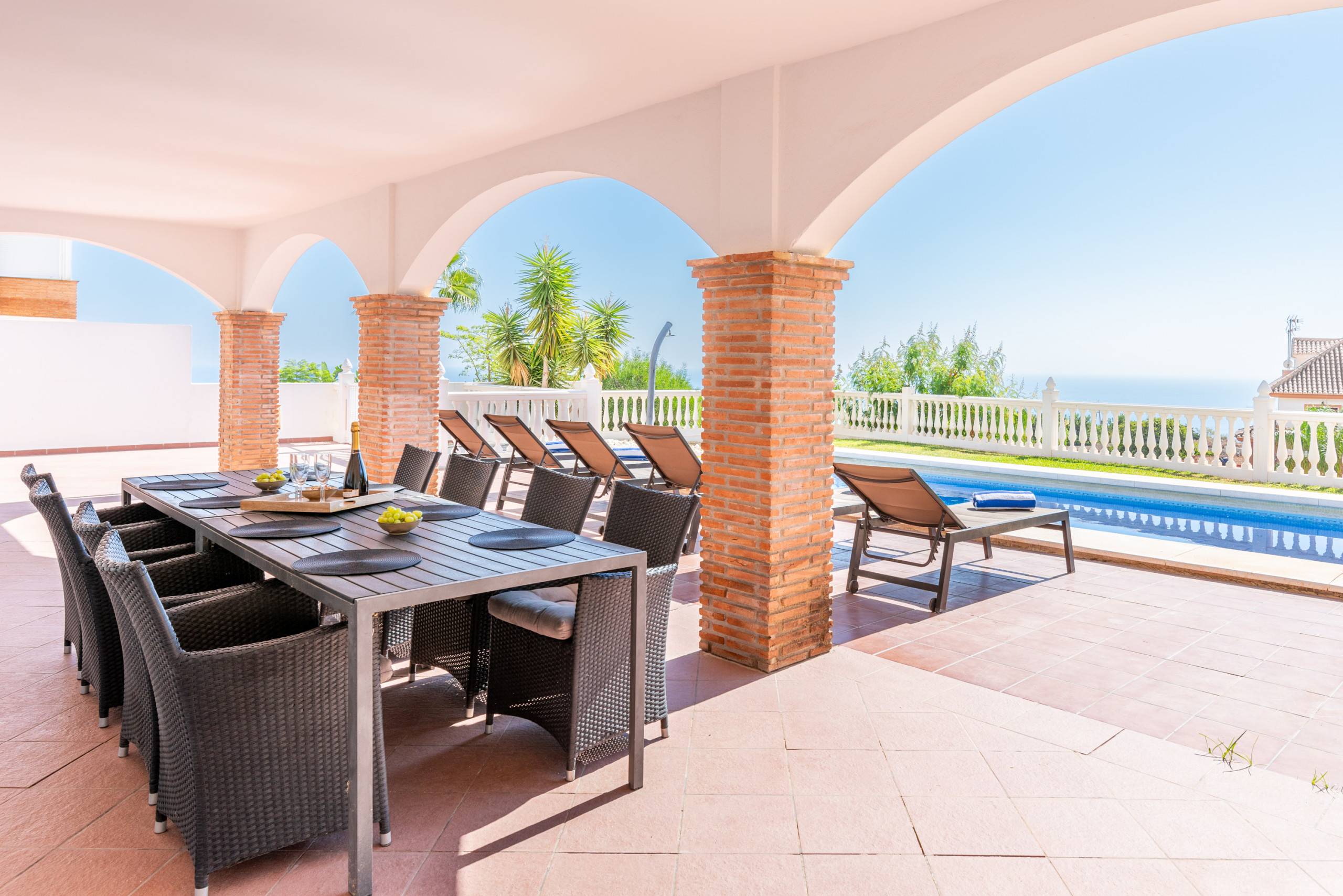 Between the main house and annex are the one of the 2 swimming pools. There are plenty of loungers and patio furniture so you can all dine together. Electric awnings. Beautiful views of Benalmadena and the Mediterranean.