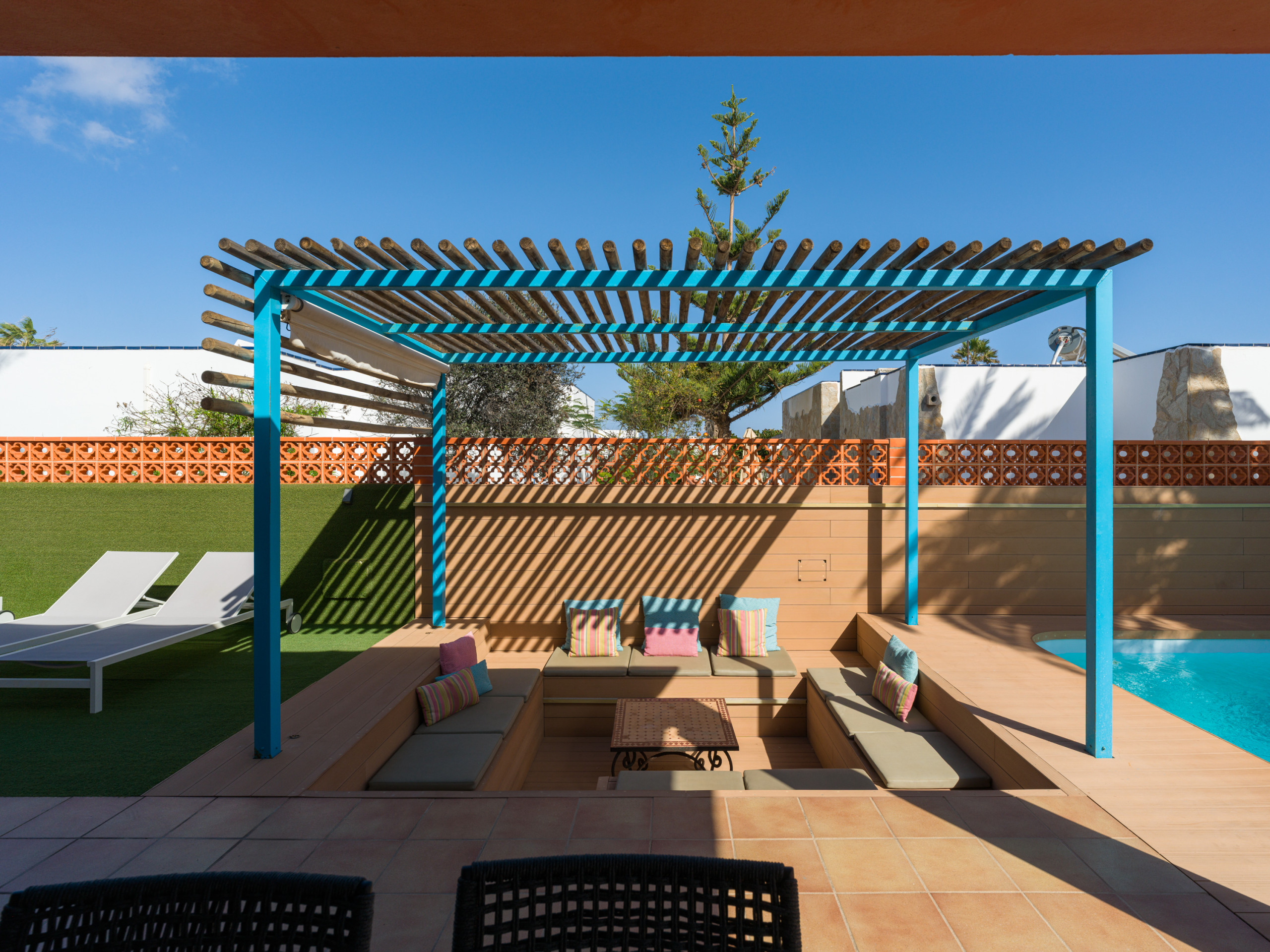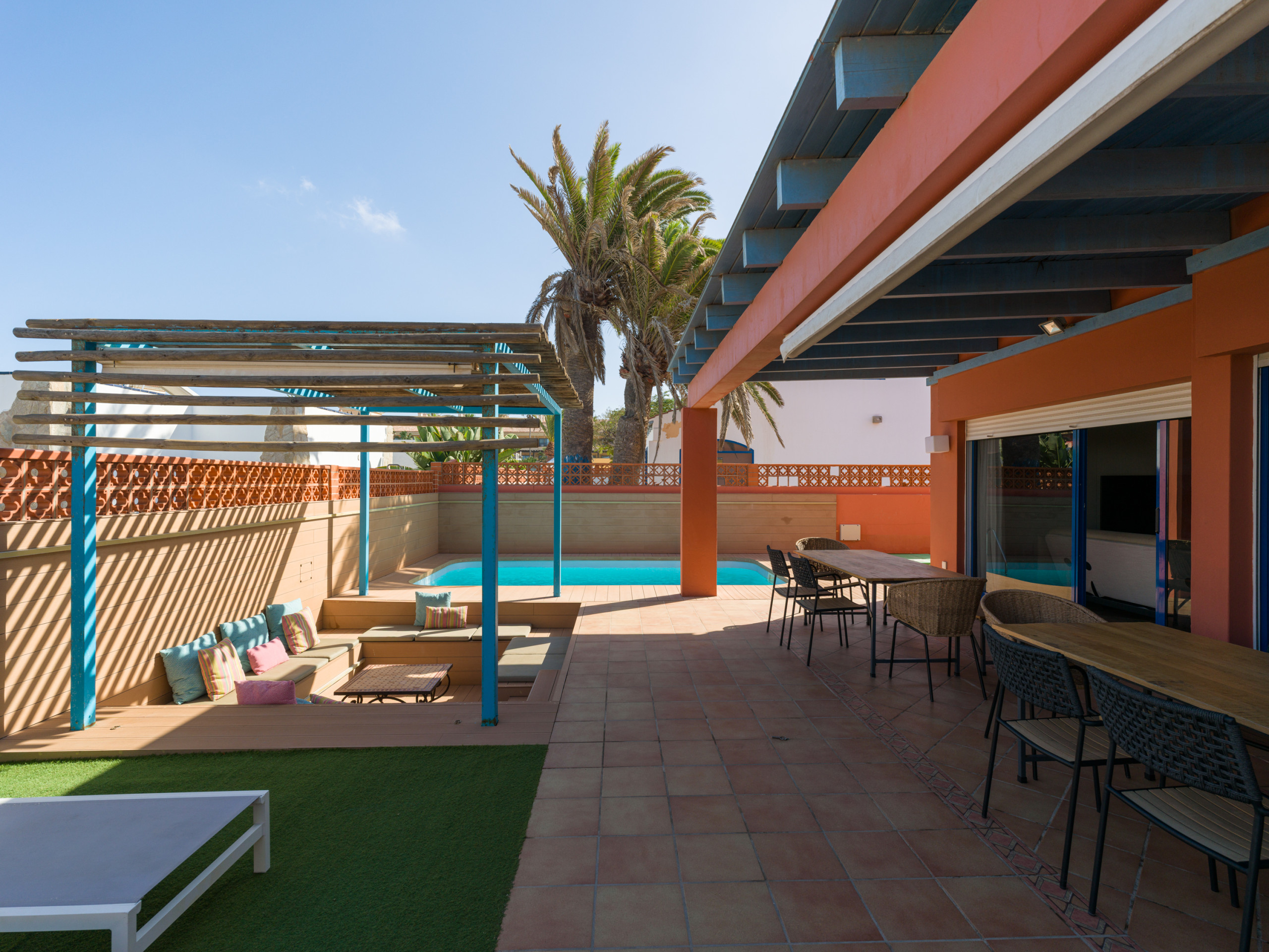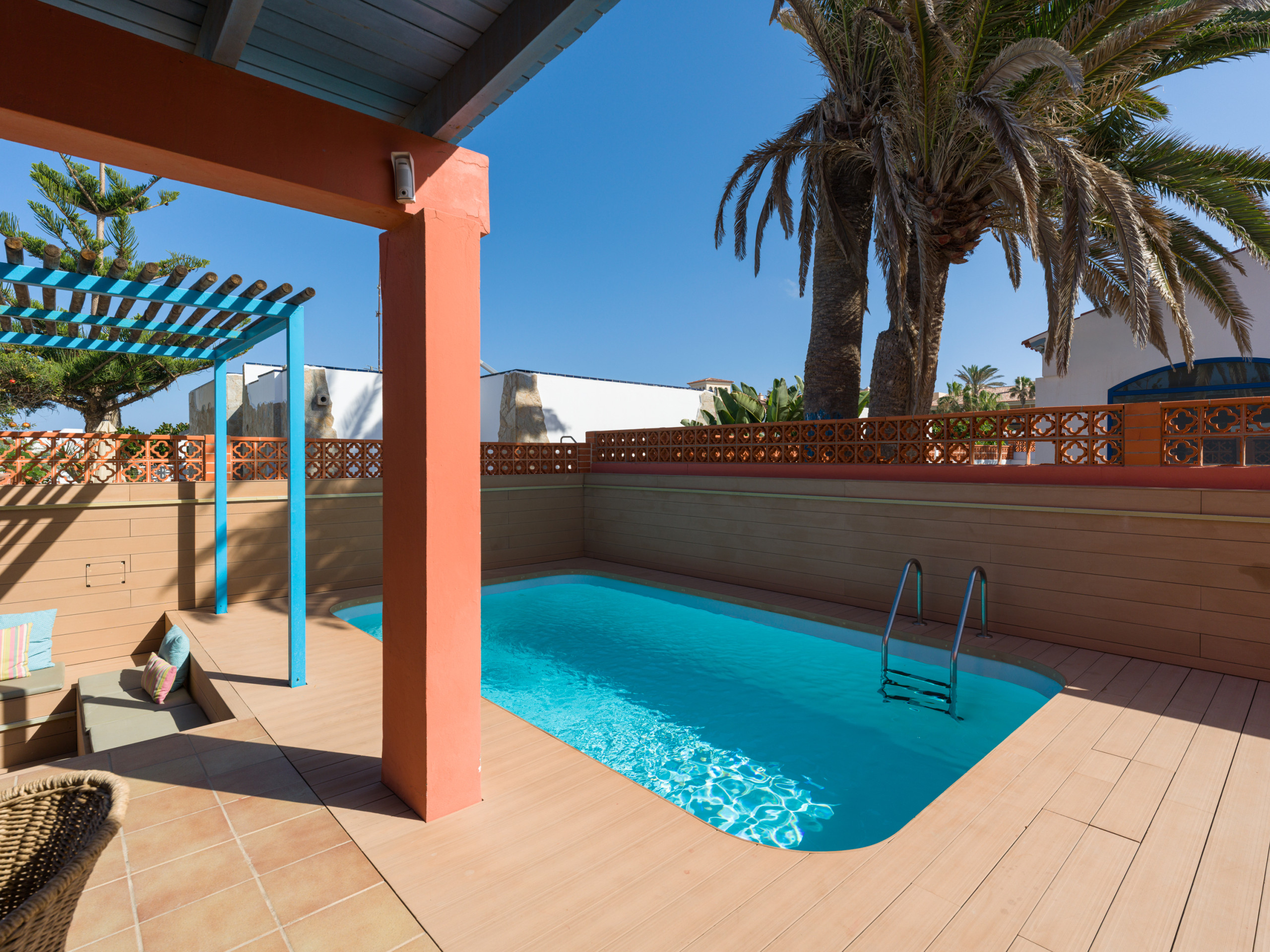 Struttura bellissima, ben servita, rifinita e accogliente su 2 piani con giardino, barbecue , chillout, posto auto e piscina! Posizione centrale a Corralejo!