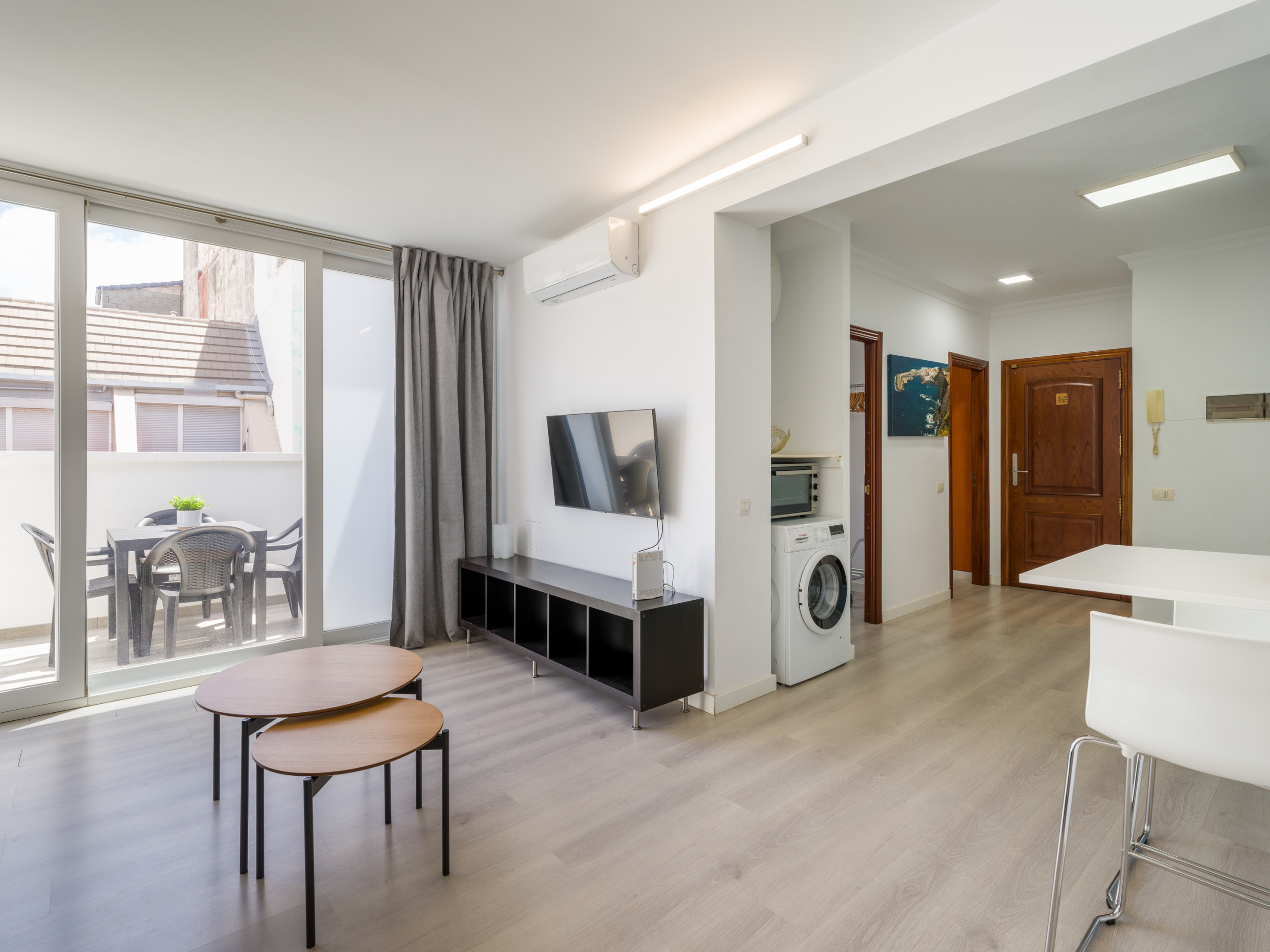 Размещение имеет лифт, 6 кв.м террасы, стиральная машина, утюг, сейф, Доступ в интернет (wi-fi), Фен, систему кондиционирования только в гостиной, гараж, 1 телевизор, радио.