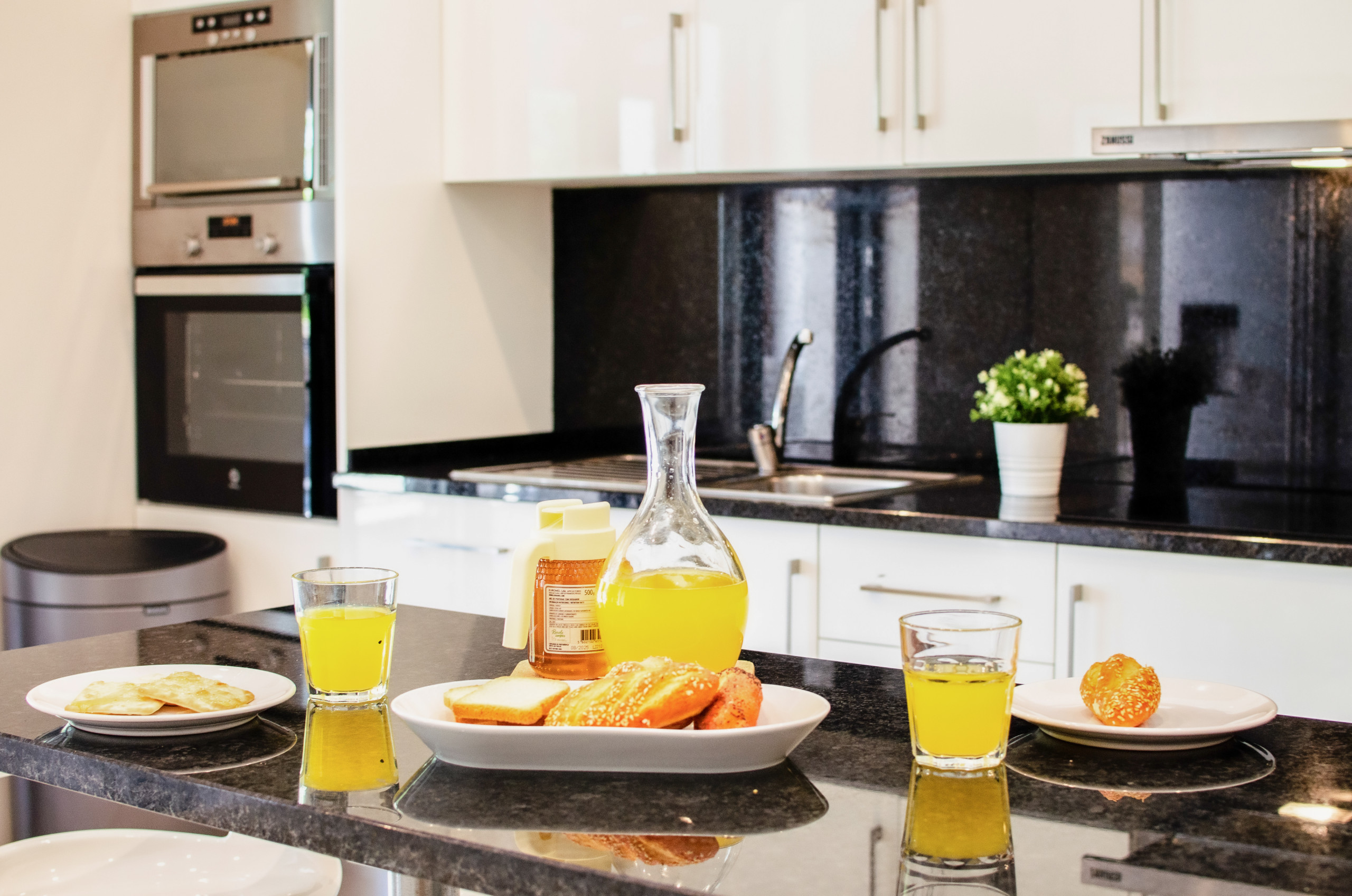 Отдельная кухня, оснащена индукционной плитой, оборудовано холодильник, микроволновая печь, духовка, морозильная камера, посудомоечная машина, столовые приборы, кухонная утварь, кофеварка, тостер и Чайник.