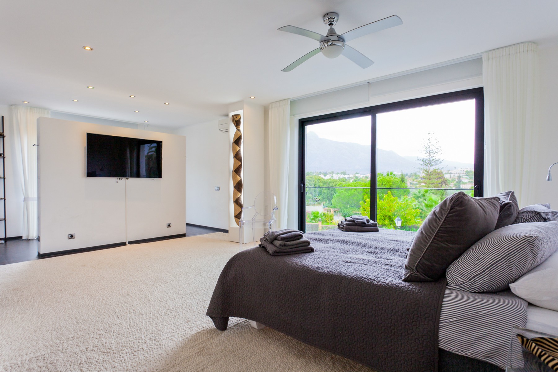 3 bedrooms: Master bedroom on the first floor. Very spacious bedroom with double bed, flat screen TV, walk-in closet, air conditioning, ceiling fan, bathroom en-suite with both shower and bathtub. Balcony and large sliding doors with a unique view to the pool area and the majestic mountains of Marbella.