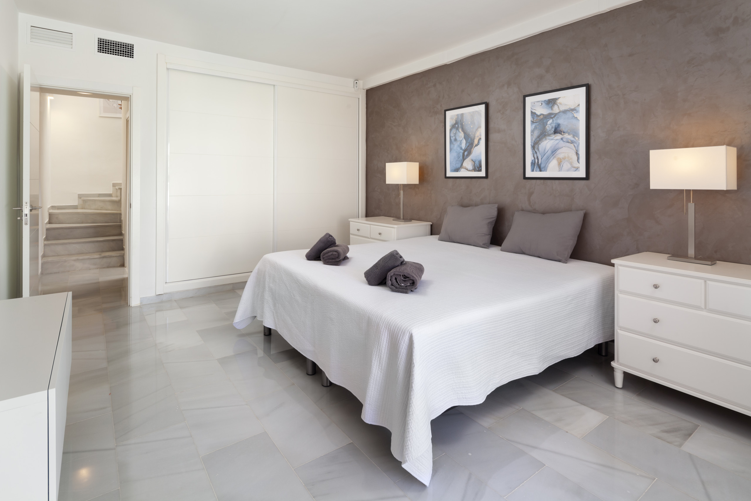 The first bedroom offers direct access to a terrace with awe-inspiring views, complete with sun loungers, providing the perfect setting for morning indulgence in the sun or afternoon literary escapes in the shade. The second bedroom features a plush double bed and a roomy wardrobe, also affording terrace access.