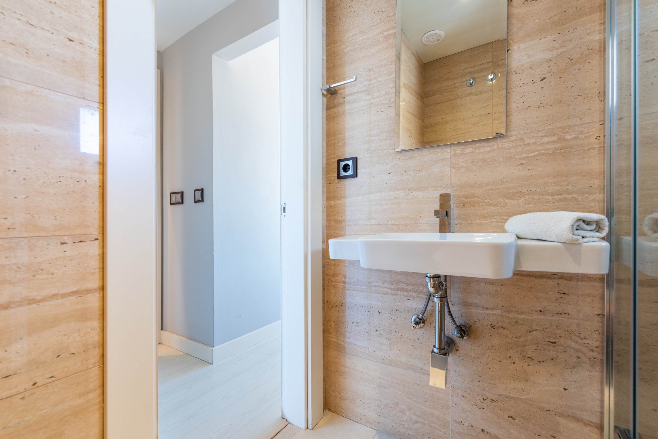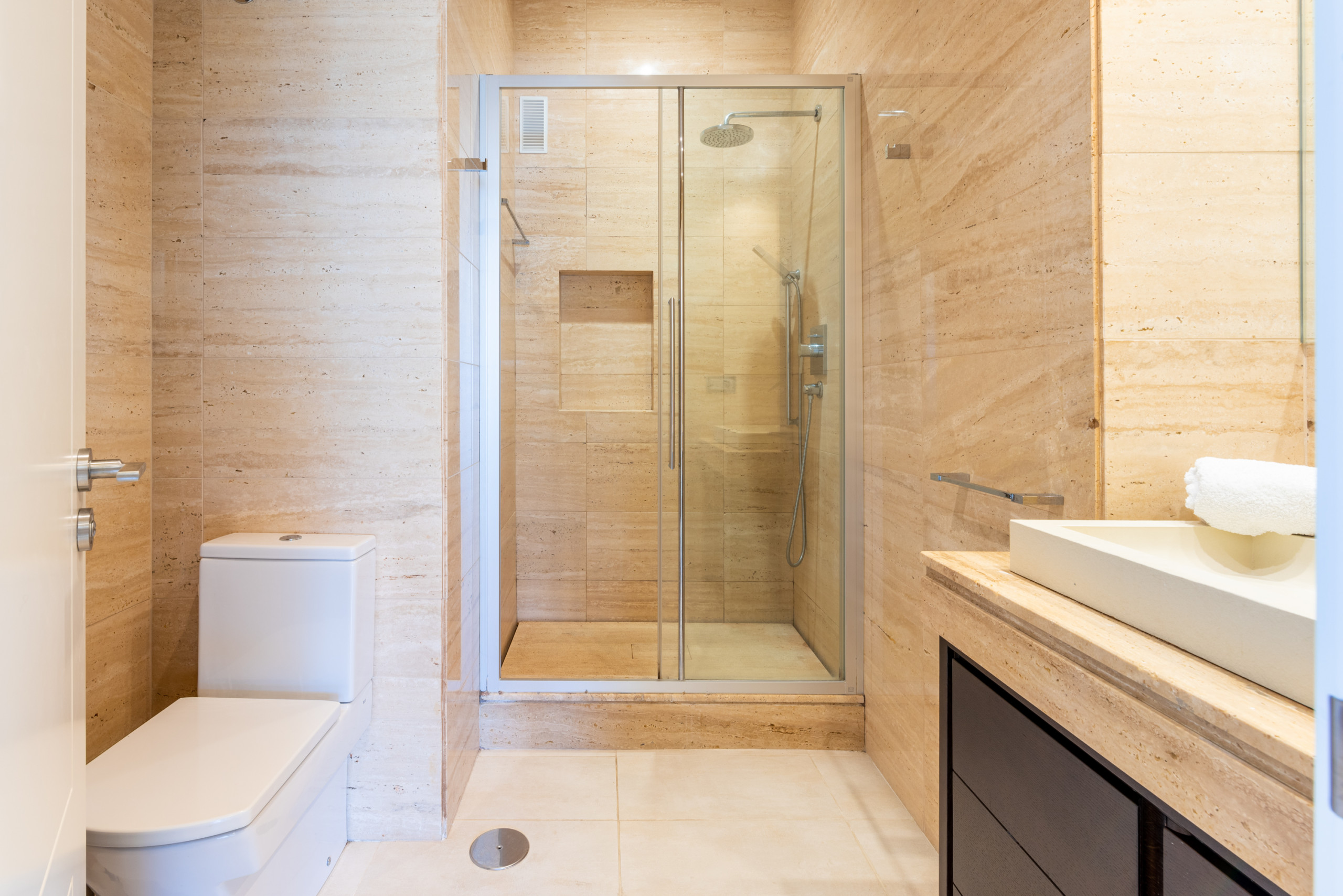 The apartment has 3 bedrooms located on the top floor, all with views of the Mediterranean, 2 bathrooms and a guest toilet.