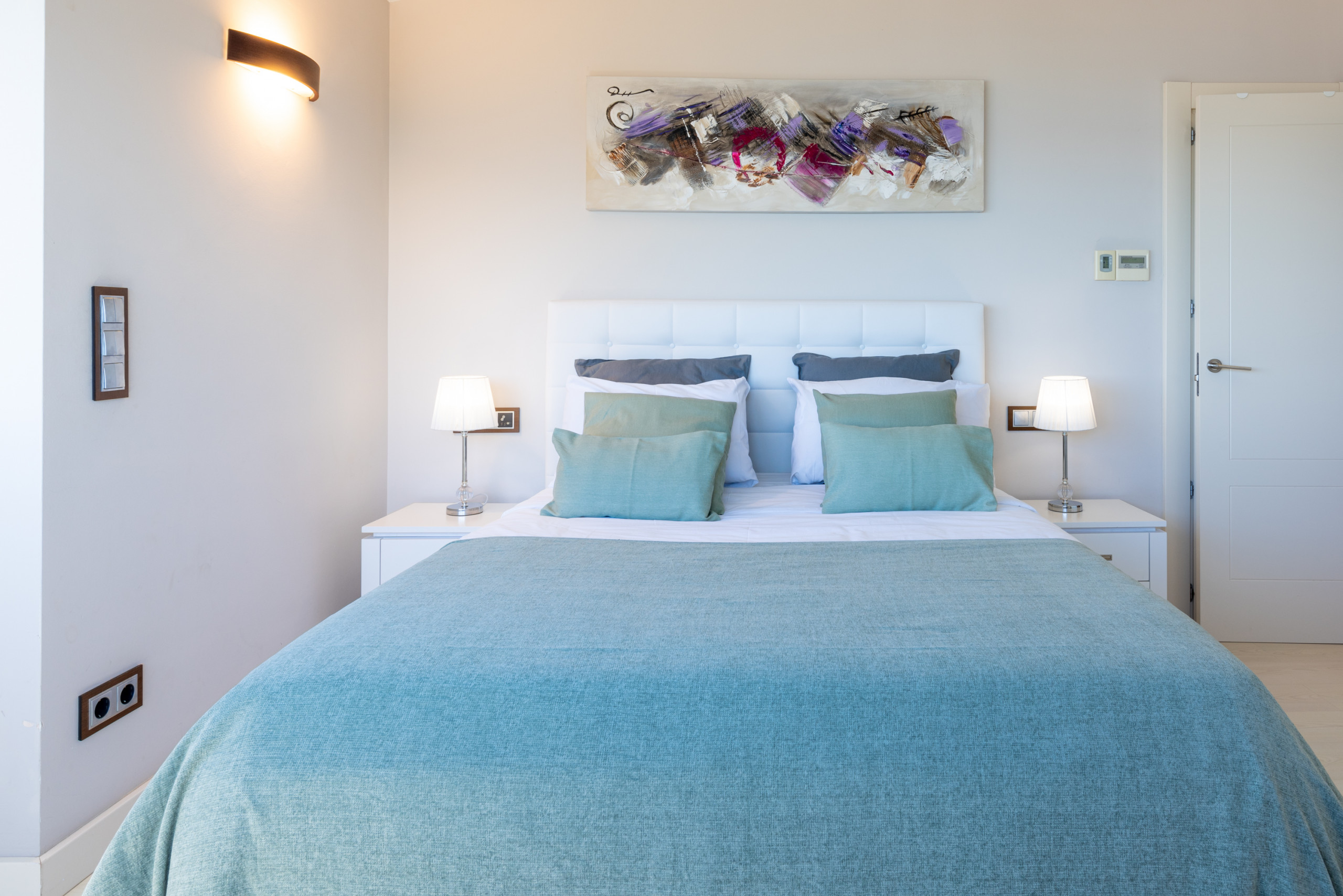 Once you enter in the apartment climbing the first set of stairs you will find the kitchen and the living room. The kitchen is equipped with most of the basic things and have fridge, microwave, coffee machine, etc, and exit to the laundry room with washing machine. Next to the kitchen, you have the living room which contains a dining area and a cosy sofa area with a smart TV and Chromecast. From the living room there is access to the terrace. Here you can relax with a coffee at all times of the day while enjoying the beautiful view to the Mediterranean Sea. From the living room climbing the second set of stairs you will access the bedrooms and 2 of the bathrooms.