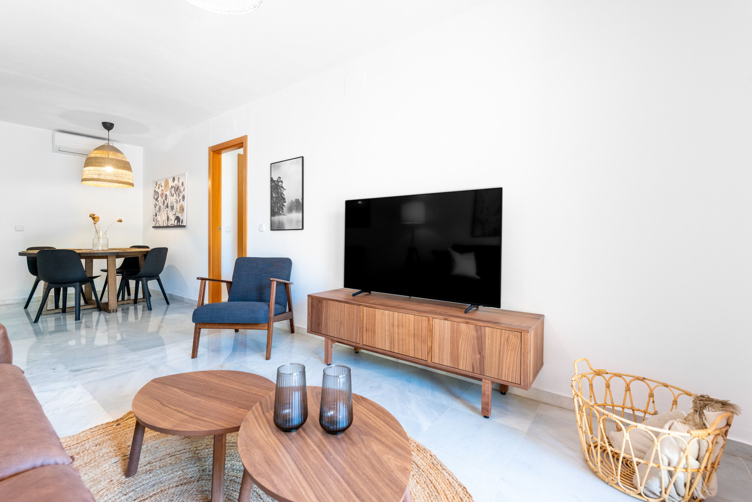The kitchen is fully equipped, you will have available an oven, microwave, dishwasher, coffee machine, etc. Next to the kitchen you have the living room which contains a dining area and a cosy sofa area where there is a Smart TV. There is direct access to the terrace a beautiful area which has a dining room table and 2 sunbeds ideal to enjoy a great family time.
