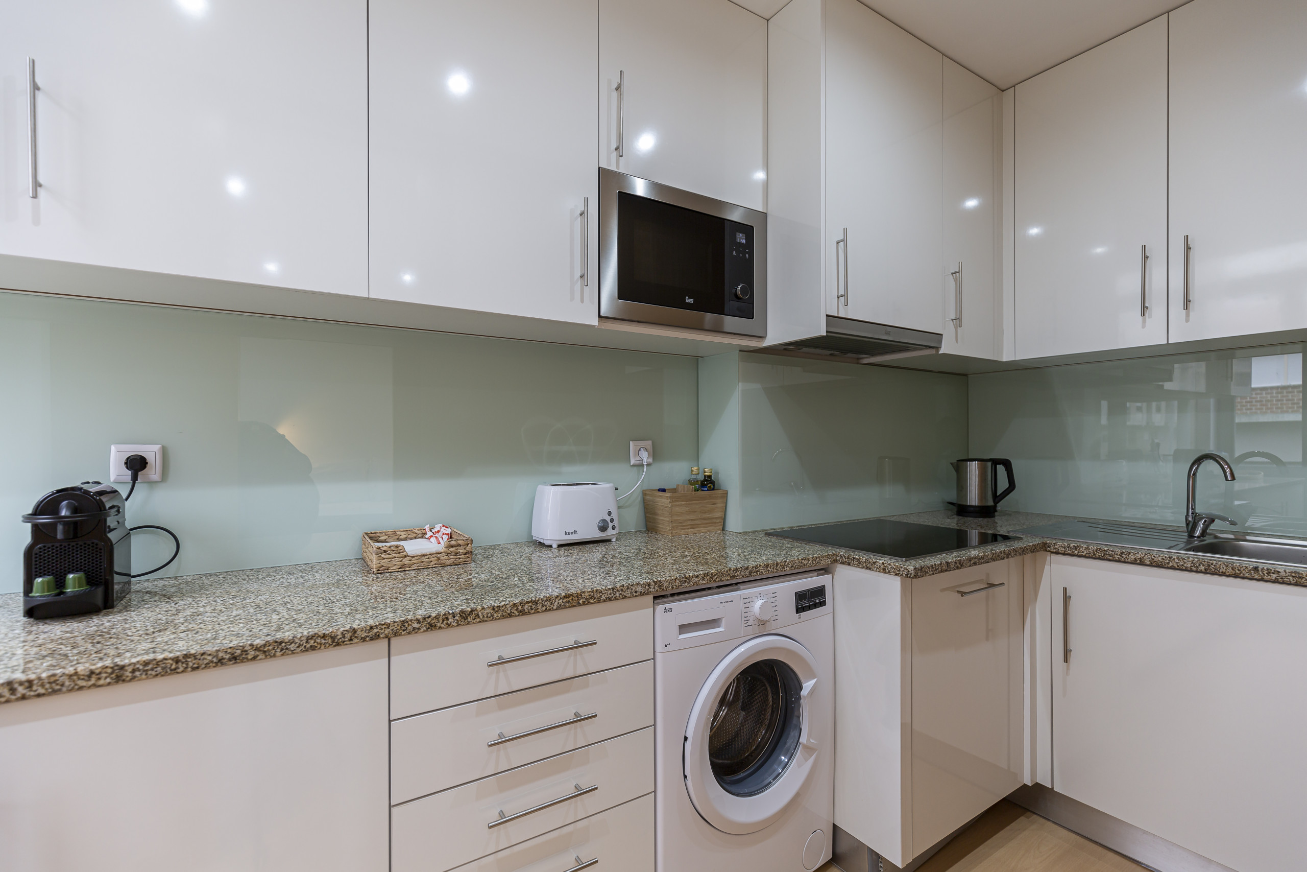 Кухня, совмещенная с залом, оснащена индукционной плитой, оборудовано холодильник, микроволновая печь, посудомоечная машина, столовые приборы, кухонная утварь, кофеварка, тостер и Чайник.