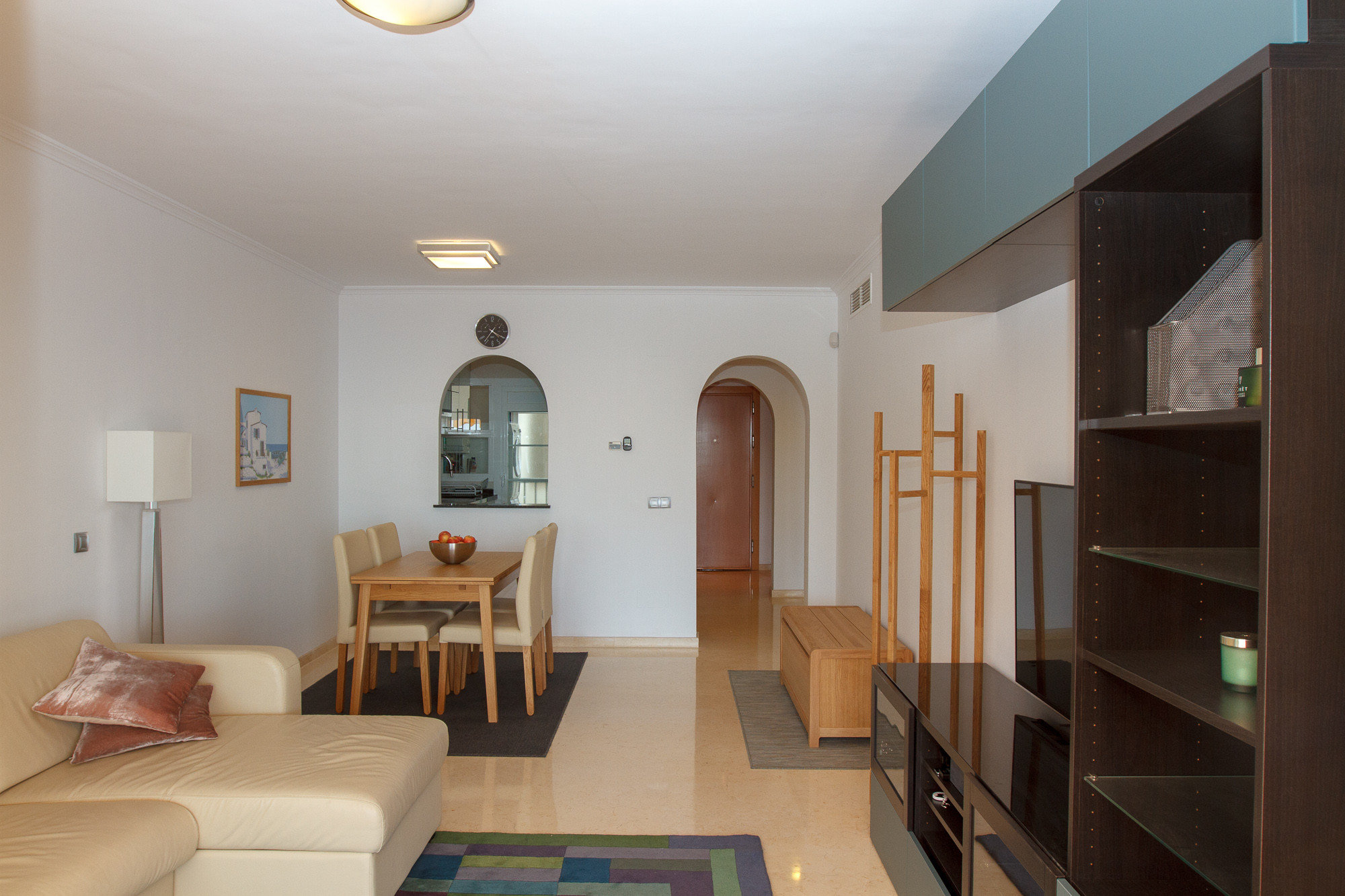 The living room is located next to the fully equipped kitchen, and there is an inside "window" connecting the two rooms. The living room also has sliding glass doors that lead you out onto the terrace, and the apartment provides a wonderful light and an open and airy feel.