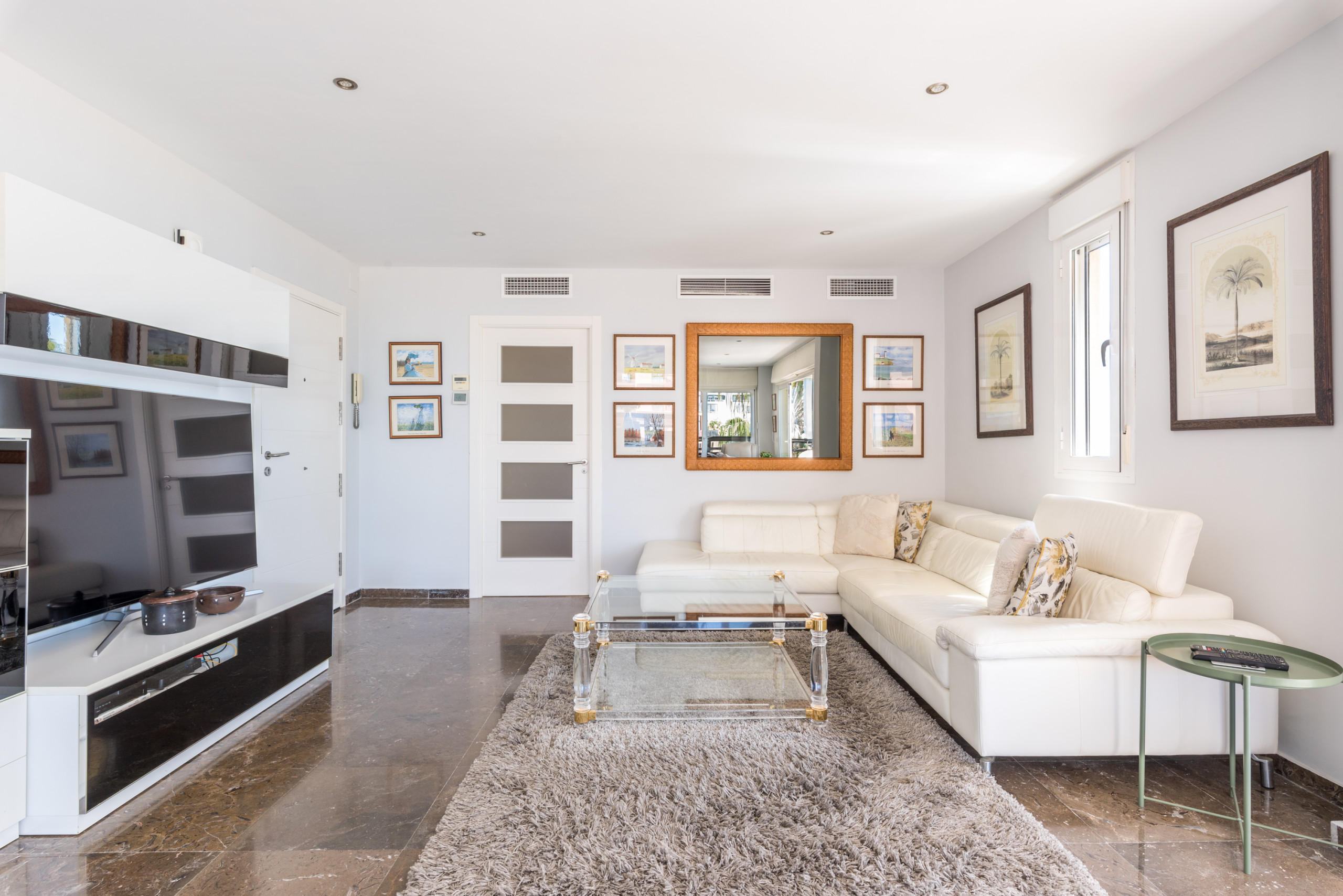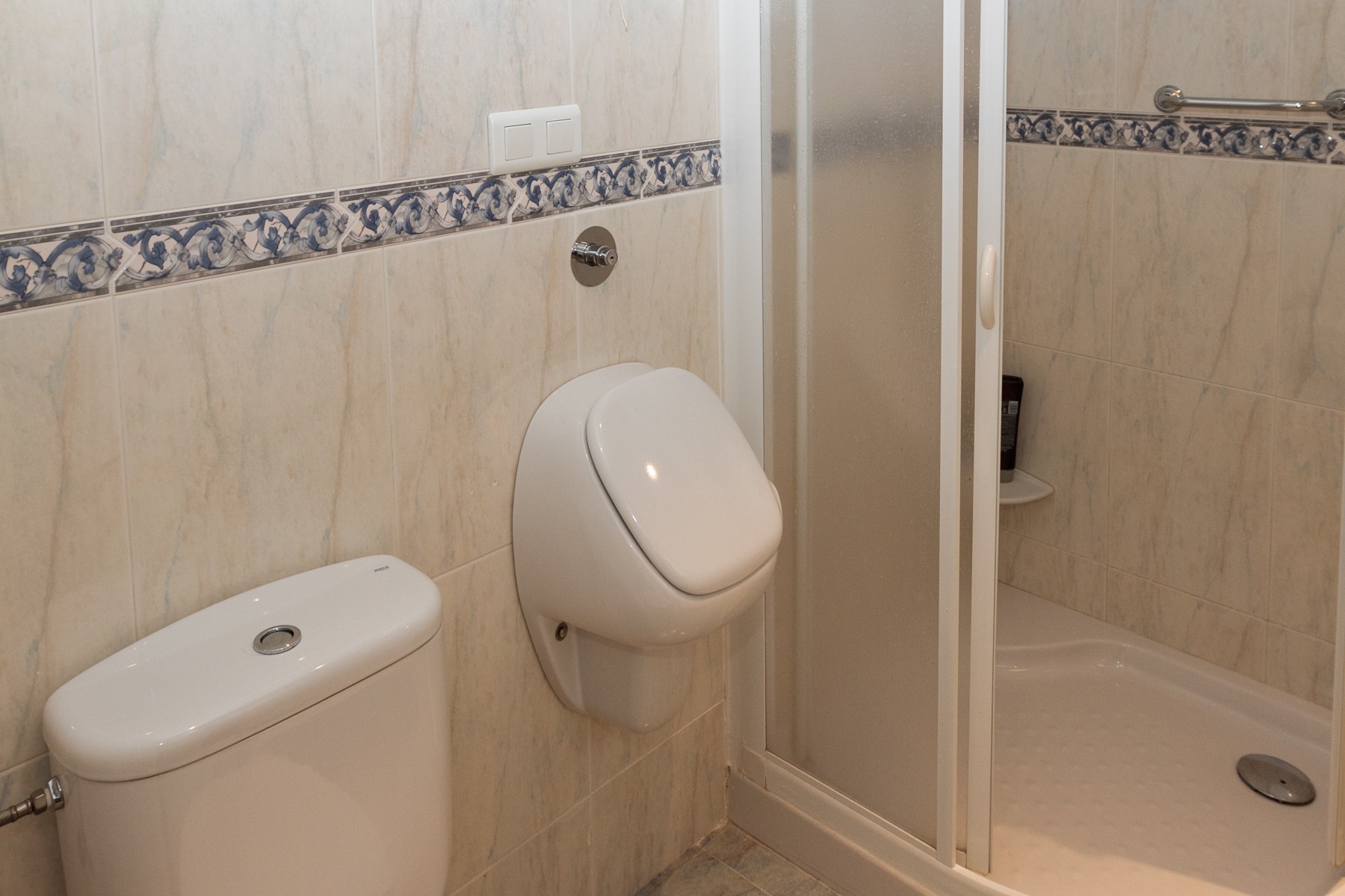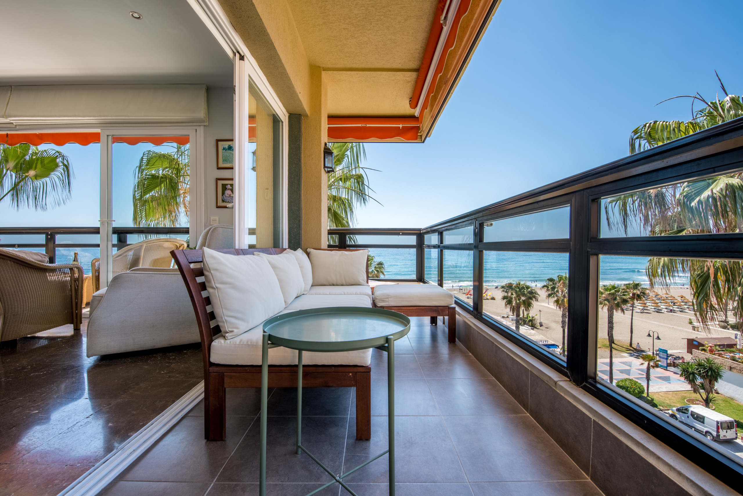 The apartment is on the 4th floor and there is of course an elevator. It is a corner apartment, which means that there is a possibility of the sun on one of the terraces throughout the day. You can start with a nice morning coffee on the east-facing terrace, which belongs to one bedroom and has a view of both the beach and to Malaga. The corner terrace is south-west facing and superbly furnished with chairs, tables and awnings.