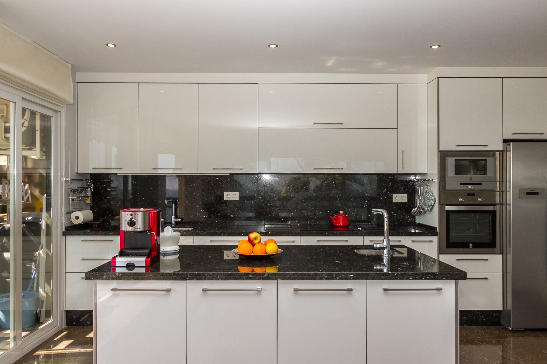 The interior is really nice and the whole apartment is beautiful furnished with quality furniture. The central room in the apartment is the open kitchen / dining area with direct access to the terrace. The kitchen is fully equipped including dishwasher, oven and a built-in deep fryer if you even want to try to make some of the delicious deep fried calamares. There is a small larder attached to the kitchen which includes a washing machine.