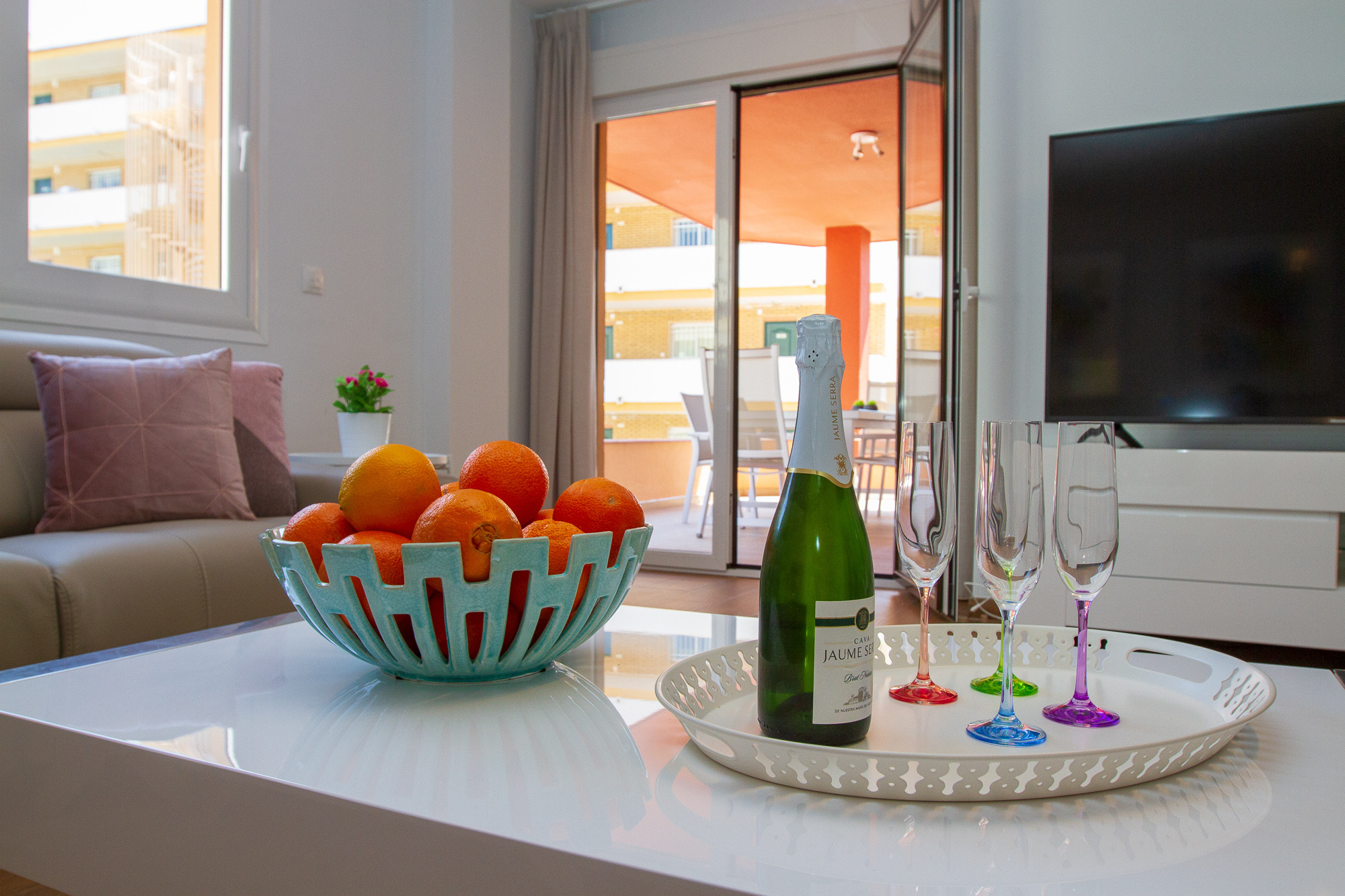 Entering into the apartment there is a large hall with access to all the rooms. The living room area at the left and a fully equipped kitchen at the right. The living room is luxury furnished and contains a dining area and a big leather sofa with a super-large flat-screen smart TV and Apple TV. From this area there is direct access to the south-faced terrace where you can enjoy the beautiful sea view. This terrace contains a dining table for 6 to 8 persons.