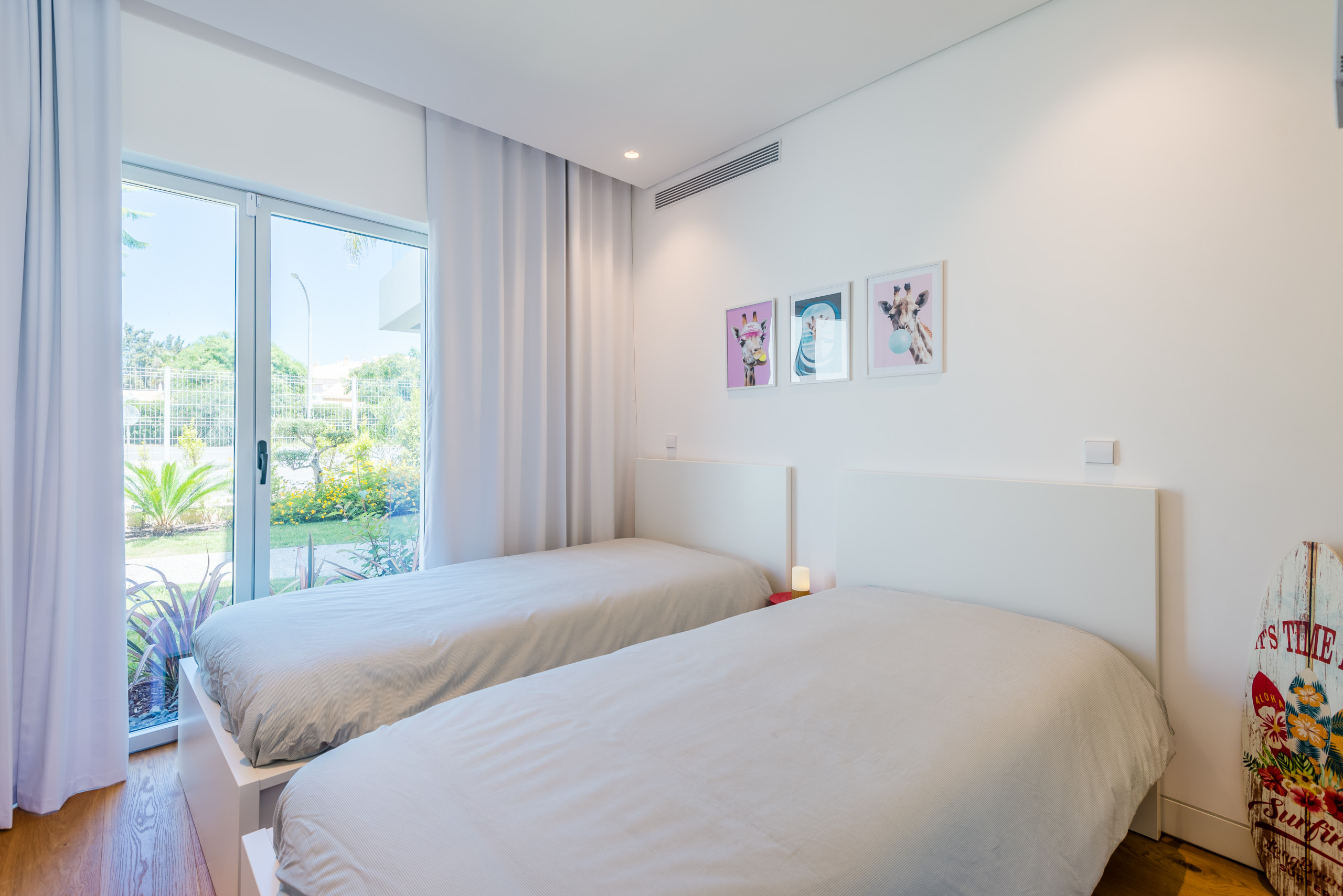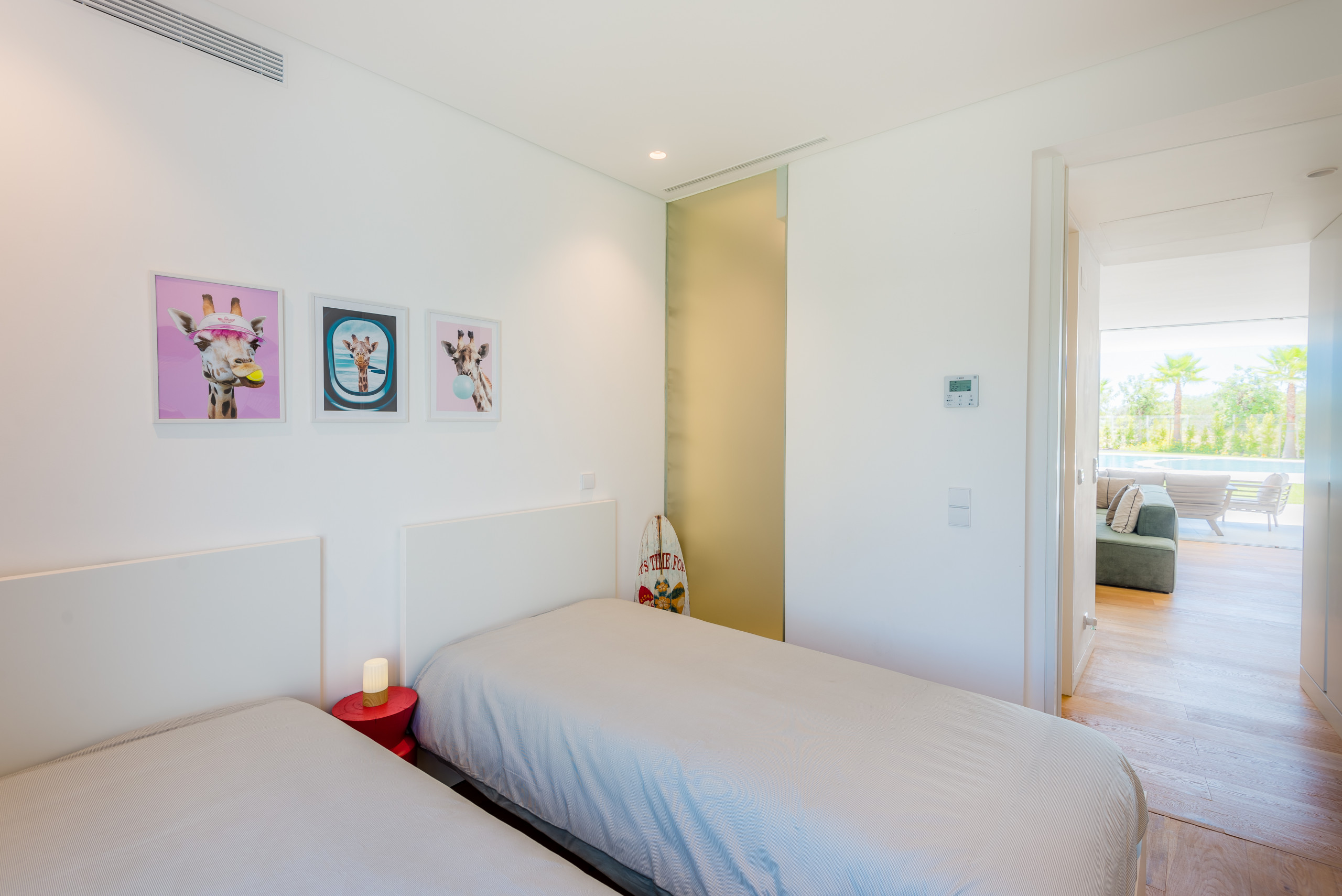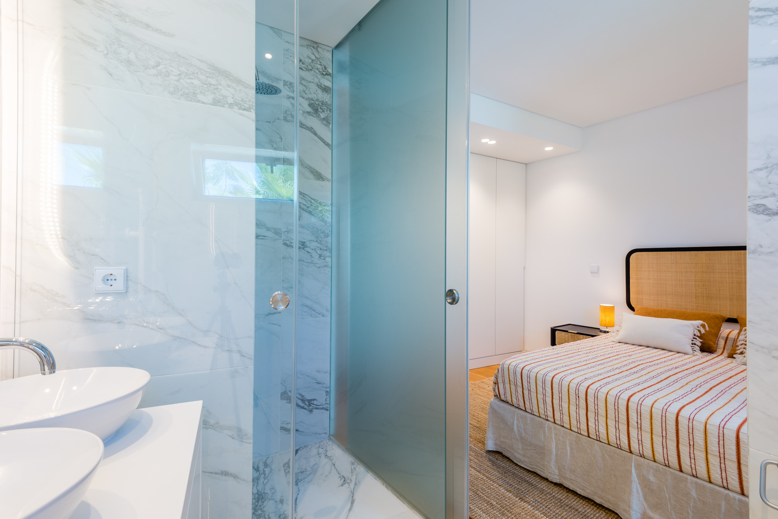 Есть две спальни, одна с большой двуспальной кроватью и вторая с двумя односпальными кроватями. В главной спальне с двуспальной кроватью есть собственная ванная комната. Также имеется вторая общая ванная комната.
